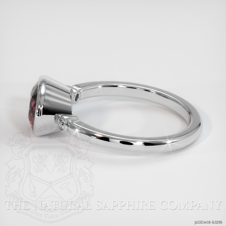 The ring features a beautiful, transparent 2.38 carat oval shape red garnet with the dimensions of 8.76 x 6.40 x 5.25 mm and a mixed brilliant cut. It has a clarity grade of eye clean (evaluated at eye level), vivid color saturation, and an excellent polish. The origin of this garnet is Ceylon (Sri Lanka).