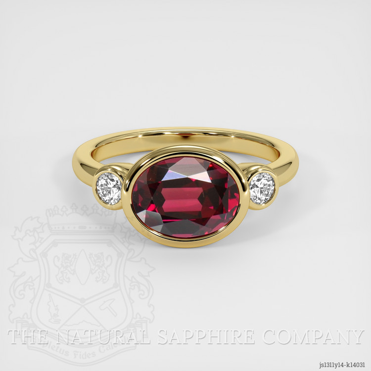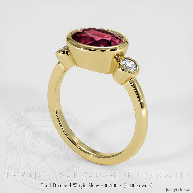 For generations garnet has been treasured as a stone of passion and protection, a gem whose deep red hues were prized by ancient craftsmen and sovereigns for its rich color and enduring presence, this ring from The Natural Gemstone Company draws on that long lineage while embracing modern standards of craftsmanship and ethics. At its center sits a transparent 3.24 carat oval shape red garnet, measuring 9.58 x 7.62 x 5.38 mm, cut in a mixed brilliant style to maximize fire and depth, evaluated as eye clean at typical viewing distance, showing vivid color saturation and an excellent polish, this is an unenhanced natural stone, sourced from Ceylon Sri Lanka, a region with a celebrated gem history. The center garnet is framed by two white round natural diamonds, weighing approximately 0.20 carats in total, graded Very Slightly Included in clarity, with classifications VS1 and VS2, and a color grade of E, their bright white brilliance providing a classical contrast to the warm garnet, the entire composition is set in lustrous 14K yellow gold, finished by hand to ensure a comfortable fit and lasting shine.
