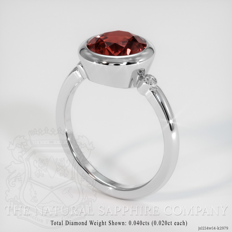 The ring features a beautiful, transparent 2.60 carat round shape red garnet with the dimensions of 8.60 x 8.34 x 5.33 mm and a mixed brilliant cut. It has a clarity grade of very slightly included (evaluated at eye level), vivid color saturation, and an excellent polish. The origin of this garnet is Tanzania.