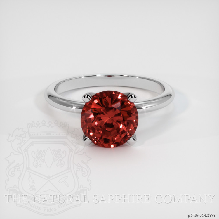 The ring features a beautiful, transparent 2.60 carat round shape red garnet with the dimensions of 8.60 x 8.34 x 5.33 mm and a mixed brilliant cut. It has a clarity grade of very slightly included (evaluated at eye level), vivid color saturation, and an excellent polish. The origin of this garnet is Tanzania.