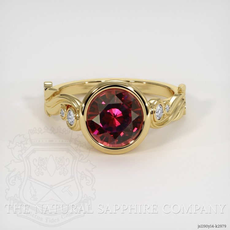 The ring features a beautiful, transparent 2.60 carat round shape red garnet with the dimensions of 8.60 x 8.34 x 5.33 mm and a mixed brilliant cut. It has a clarity grade of very slightly included (evaluated at eye level), vivid color saturation, and an excellent polish. The origin of this garnet is Tanzania.