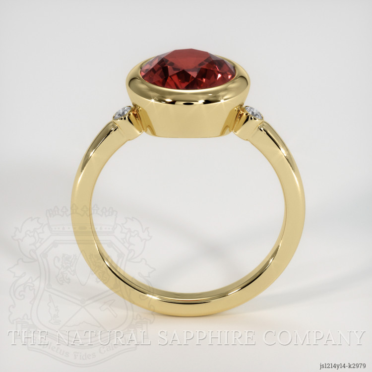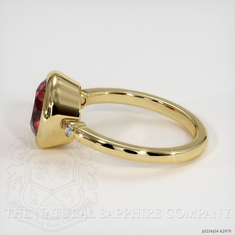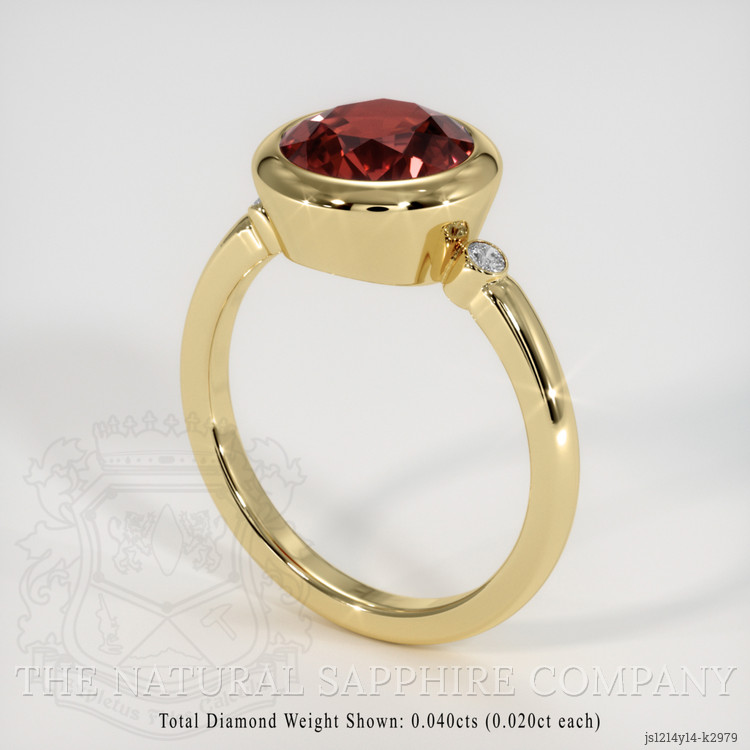The ring features a beautiful, transparent 2.60 carat round shape red garnet with the dimensions of 8.60 x 8.34 x 5.33 mm and a mixed brilliant cut. It has a clarity grade of very slightly included (evaluated at eye level), vivid color saturation, and an excellent polish. The origin of this garnet is Tanzania.
