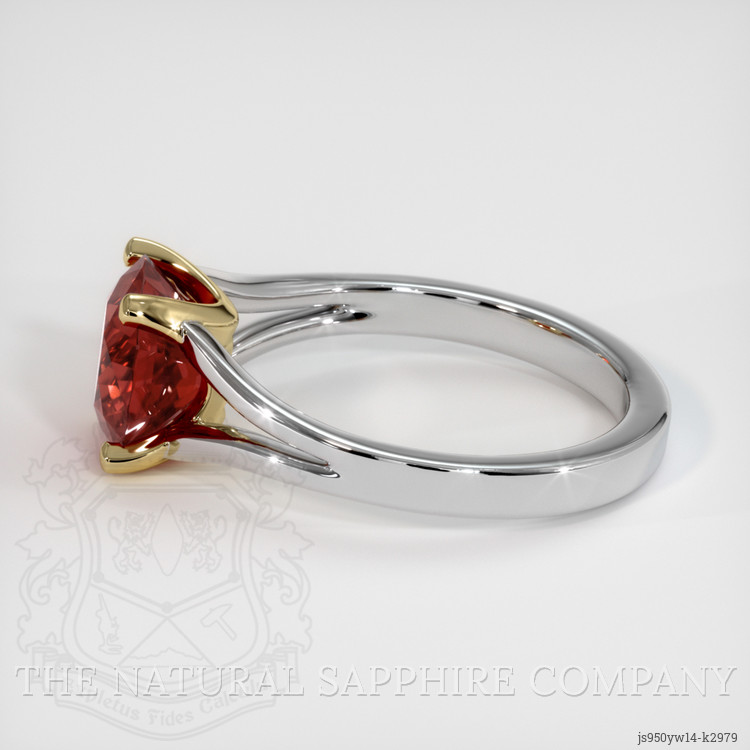 The ring features a beautiful, transparent 2.60 carat round shape red garnet with the dimensions of 8.60 x 8.34 x 5.33 mm and a mixed brilliant cut. It has a clarity grade of very slightly included (evaluated at eye level), vivid color saturation, and an excellent polish. The origin of this garnet is Tanzania.