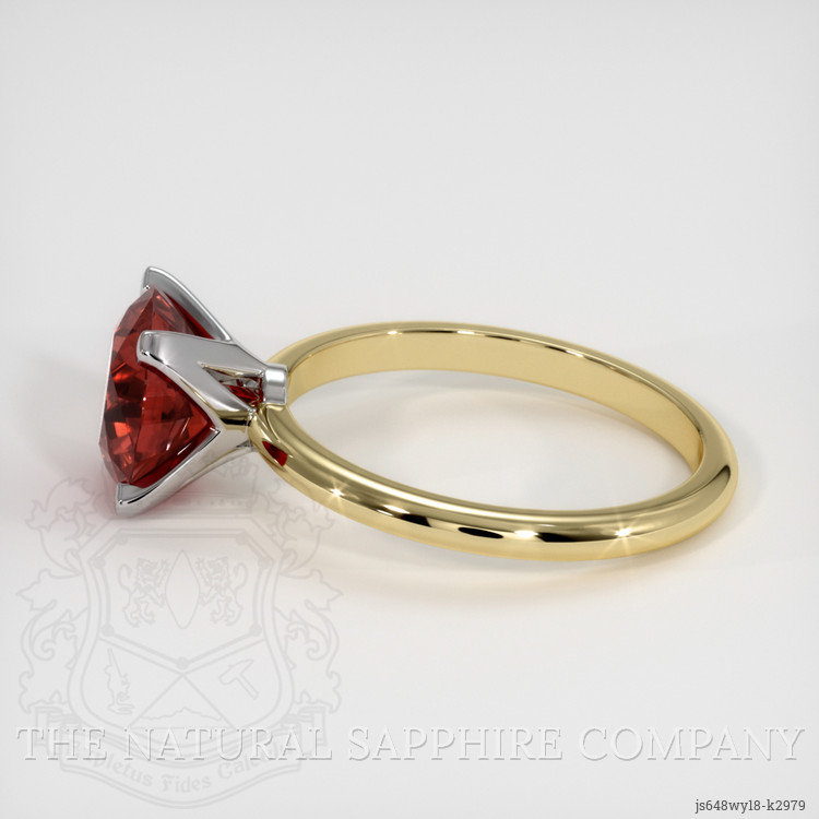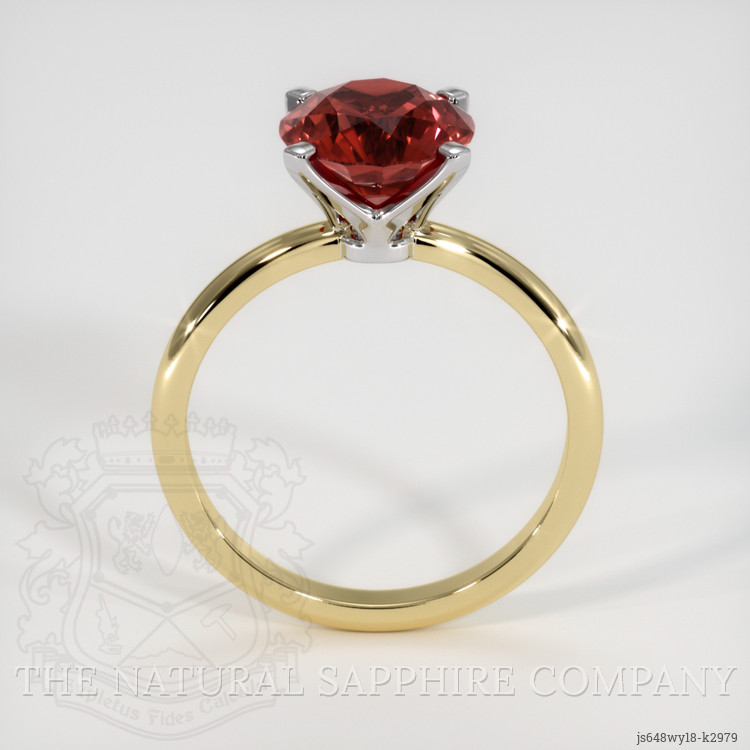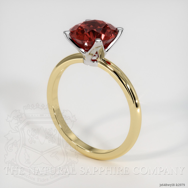 The ring features a beautiful, transparent 2.60 carat round shape red garnet with the dimensions of 8.60 x 8.34 x 5.33 mm and a mixed brilliant cut. It has a clarity grade of very slightly included (evaluated at eye level), vivid color saturation, and an excellent polish. The origin of this garnet is Tanzania.