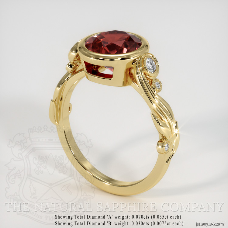 The ring features a beautiful, transparent 2.60 carat round shape red garnet with the dimensions of 8.60 x 8.34 x 5.33 mm and a mixed brilliant cut. It has a clarity grade of very slightly included (evaluated at eye level), vivid color saturation, and an excellent polish. The origin of this garnet is Tanzania.