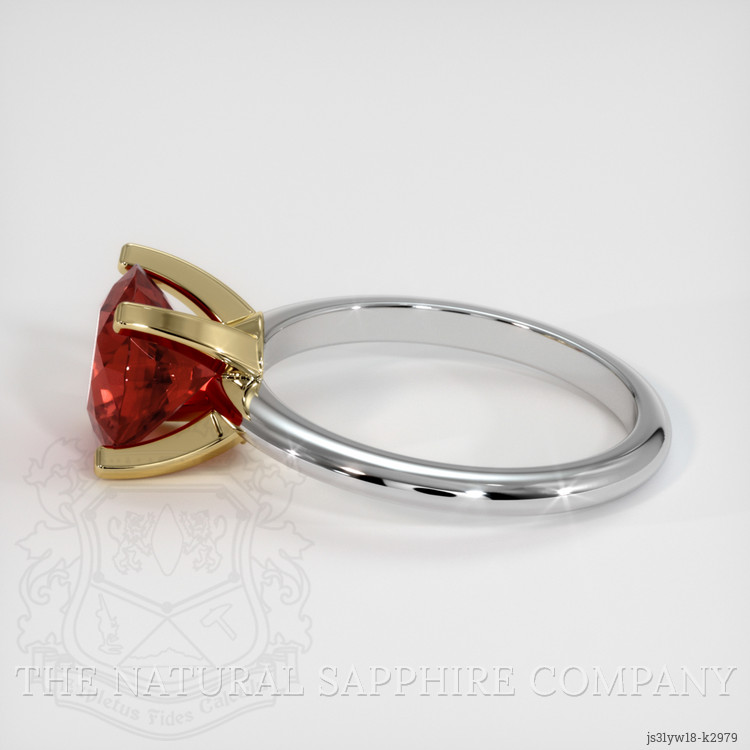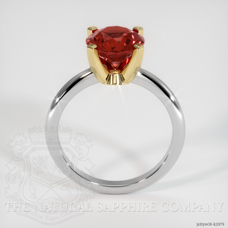 The ring features a beautiful, transparent 2.60 carat round shape red garnet with the dimensions of 8.60 x 8.34 x 5.33 mm and a mixed brilliant cut. It has a clarity grade of very slightly included (evaluated at eye level), vivid color saturation, and an excellent polish. The origin of this garnet is Tanzania.