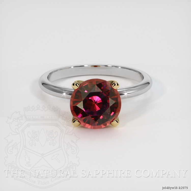 The ring features a beautiful, transparent 2.60 carat round shape red garnet with the dimensions of 8.60 x 8.34 x 5.33 mm and a mixed brilliant cut. It has a clarity grade of very slightly included (evaluated at eye level), vivid color saturation, and an excellent polish. The origin of this garnet is Tanzania.