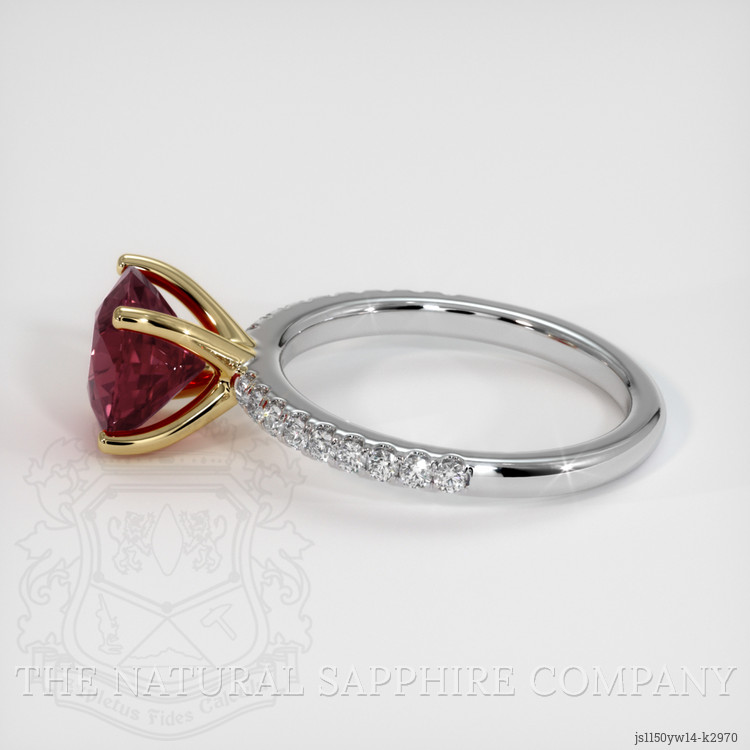The ring features a beautiful, transparent 2.86 carat round shape red garnet with the dimensions of 8.60 x 8.48 x 5.60 mm and a mixed brilliant cut. It has a clarity grade of eye clean (evaluated at eye level), vivid color saturation, and an excellent polish. The origin of this garnet is Tanzania.