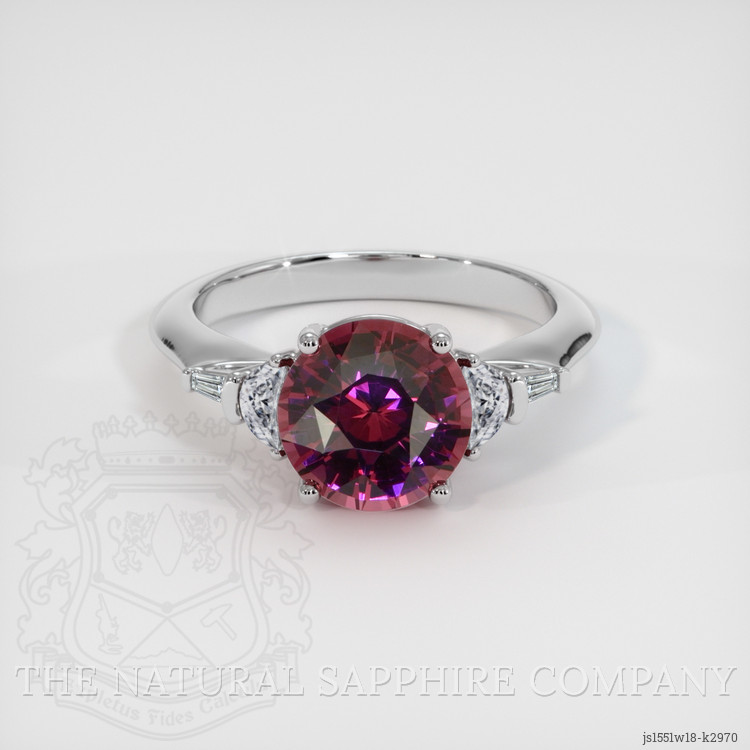 The ring features a beautiful, transparent 2.86 carat round shape red garnet with the dimensions of 8.60 x 8.48 x 5.60 mm and a mixed brilliant cut. It has a clarity grade of eye clean (evaluated at eye level), vivid color saturation, and an excellent polish. The origin of this garnet is Tanzania.