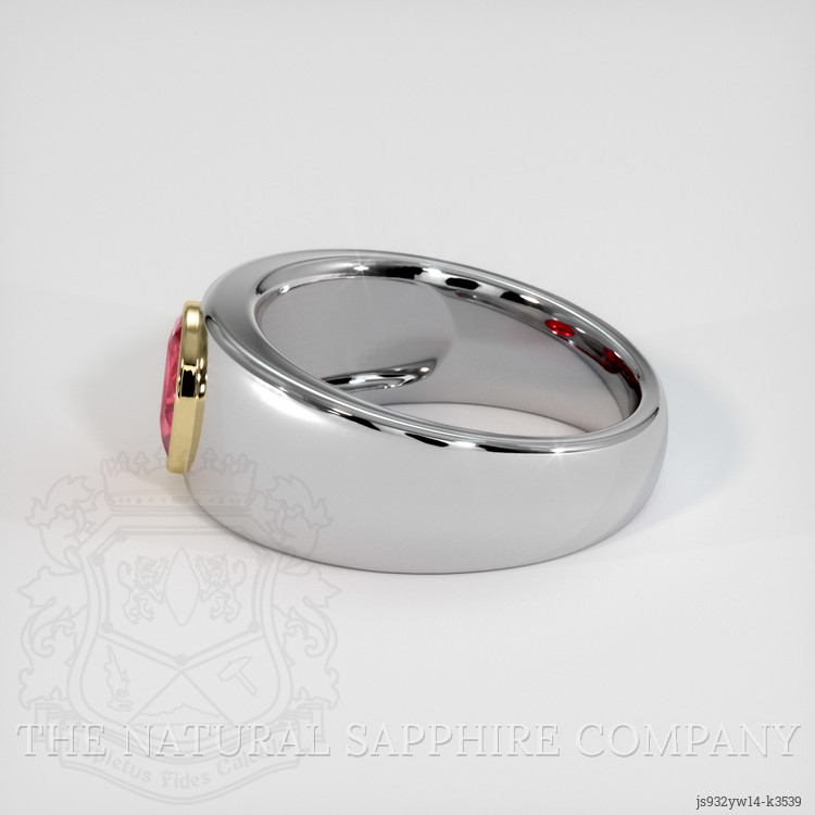 The men's ring features a beautiful, transparent 1.24 carat oval shape red spinel with the dimensions of 7.27 x 5.82 x 4.02 mm and a mixed brilliant cut. It has a clarity grade of very slightly included (evaluated at eye level), intense color saturation, and an excellent polish. The origin of this spinel is Ceylon (Sri Lanka).