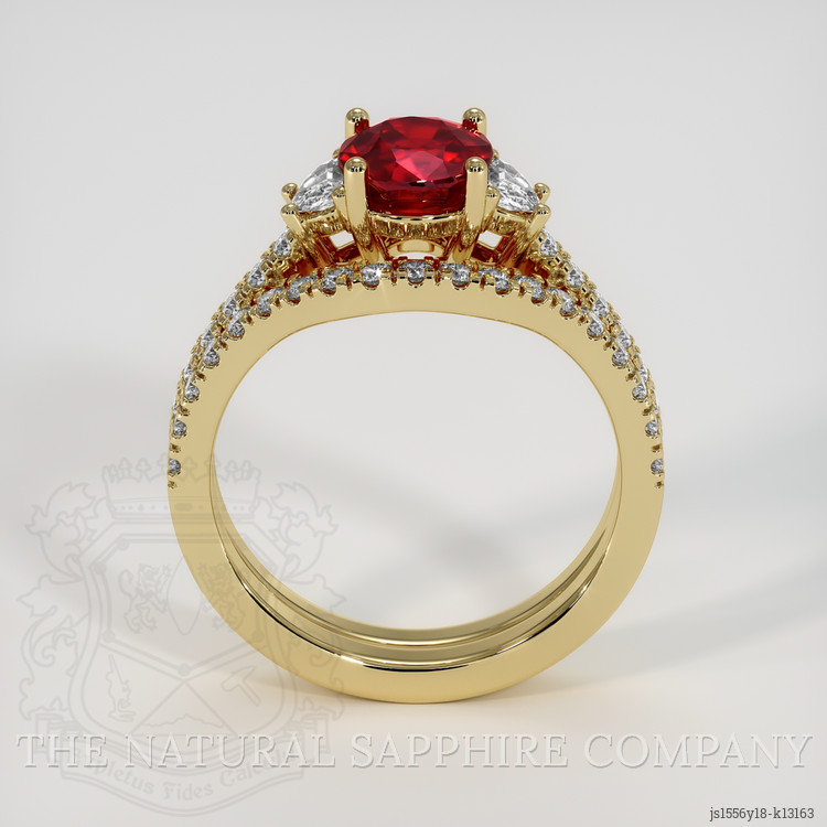 The ring around this rare spinel is a conversation between classic elegance and meticulous craftsmanship, set entirely in 18K yellow gold to complement the warm, ruby like tone of the center stone. Flanking the oval spinel are two white half moon shaped natural diamonds weighing approximately 0.30 carats combined, graded very slightly included in the VS1 and VS2 range, with a color grade of E that gives a cool, bright contrast to the red center. The shoulders are paved with white round shaped natural diamonds, two lines of stones weighing approximately 0.33 carats each, clarity VS and color grade F and G, creating a scintillating ribbon of light that elevates the center without overwhelming it. The mixed brilliant cut of the spinel harmonizes with the round cuts of the diamonds, giving the ring a balanced symmetry that is deeply considered, and the prong setting is engineered to both showcase the spinel and secure it, allowing the gem to sit proudly above the band while capturing maximum light. When you wear this ring you carry a journey from Burmese riverbeds through skilled hands, to the finish at The Natural Gemstone Company, a piece that celebrates origin, craft, and the natural story embedded in every facet.