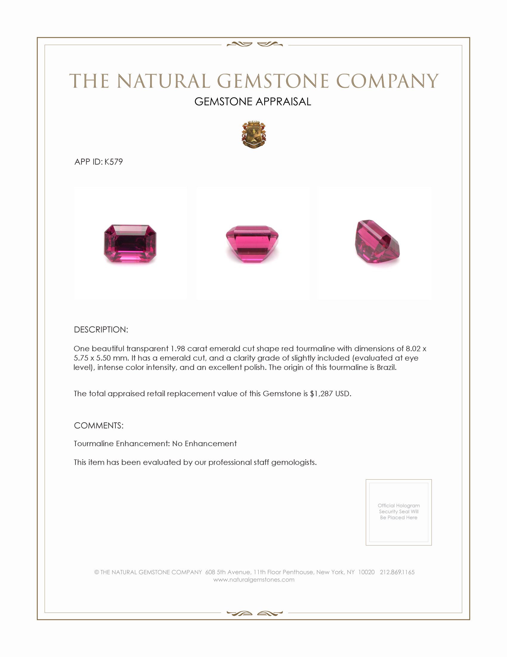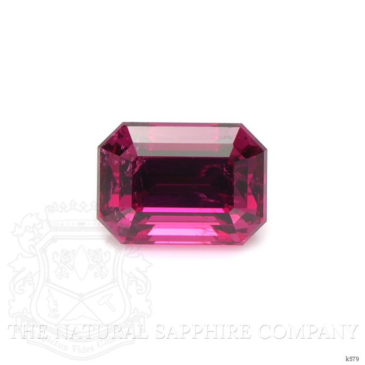 The men's ring features a beautiful, transparent 1.98 carat emerald cut shape red tourmaline with the dimensions of 8.02 x 5.75 x 5.50 mm and a emerald cut. It has a clarity grade of slightly included (evaluated at eye level), intense color saturation, and an excellent polish. The origin of this tourmaline is Brazil.