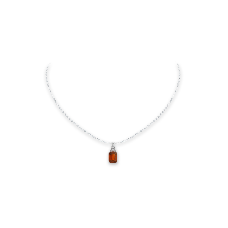 In the heart of our cherished collections from The Natural Gemstone Company lies a piece of enduring beauty, where the whisper of romance dances with the elegance of a star's hidden glow. The pendant, bathed in the purity of 18K white gold, cradles an emerald-cut hessonite garnet, a gemstone born from the ancient lands of Namibia. With its reddish-orange allure, it captures the passion of a sunset's embrace, where the day's finale surrenders to the evening's tender, blossoming twilight. This 4.55 carat marvel, with its precise dimensions and slightly included clarity, reflects sincerity through its vivid saturation, much like the raw candor found in a lover's gaze.