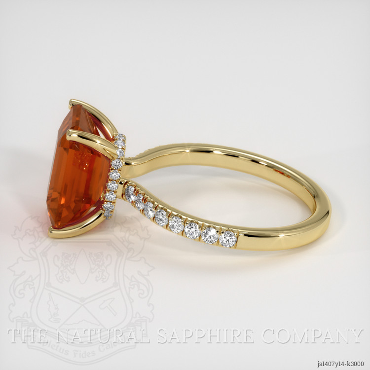 The ring features a beautiful, transparent GIA certified Reddish Orange 4.55 carat emerald cut shape reddish orange grossulargarnet with the dimensions of 11.03 x 8.45 x 5.20 mm and a emerald cut. It has a clarity grade of slightly included (evaluated at eye level), vivid color saturation, and an excellent polish. The origin of this grossulargarnet is Nambia.