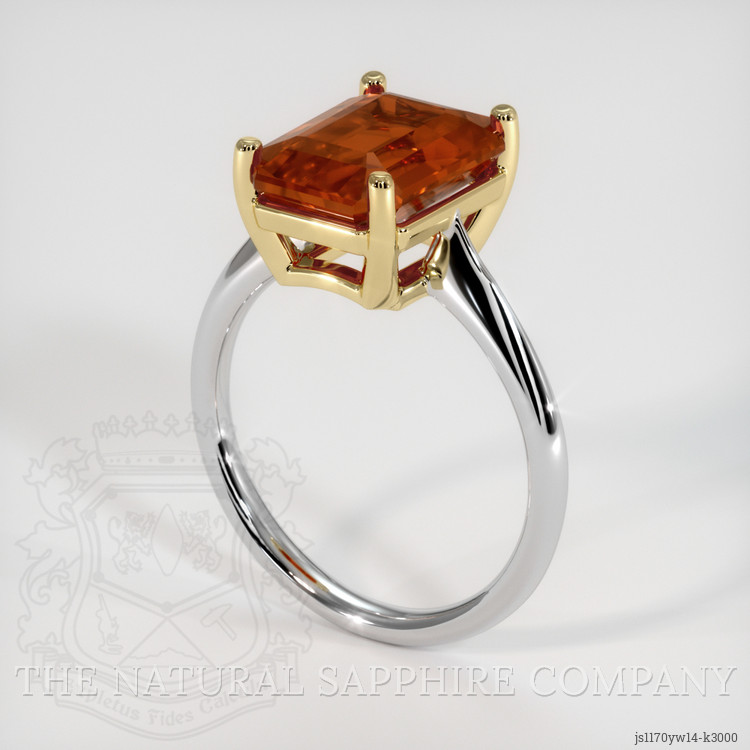 The ring features a beautiful, transparent GIA certified Reddish Orange 4.55 carat emerald cut shape reddish orange grossulargarnet with the dimensions of 11.03 x 8.45 x 5.20 mm and a emerald cut. It has a clarity grade of slightly included (evaluated at eye level), vivid color saturation, and an excellent polish. The origin of this grossulargarnet is Nambia.