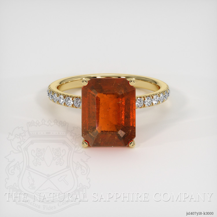 The ring features a beautiful, transparent GIA certified Reddish Orange 4.55 carat emerald cut shape reddish orange grossulargarnet with the dimensions of 11.03 x 8.45 x 5.20 mm and a emerald cut. It has a clarity grade of slightly included (evaluated at eye level), vivid color saturation, and an excellent polish. The origin of this grossulargarnet is Nambia.