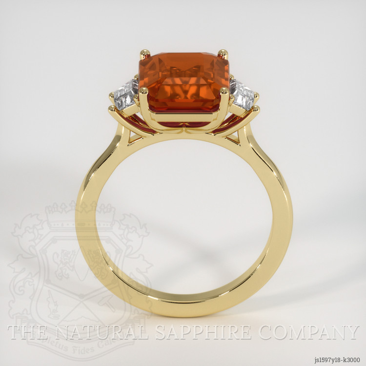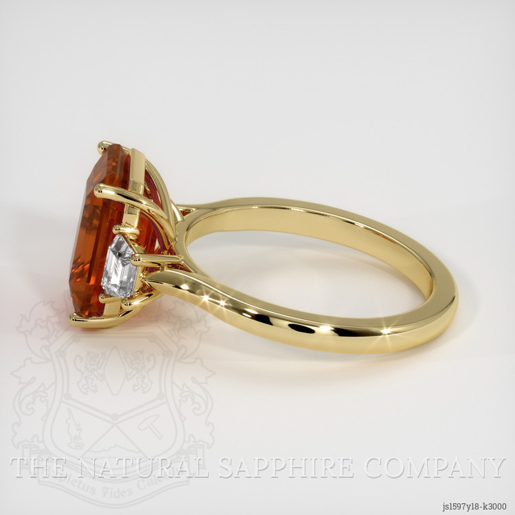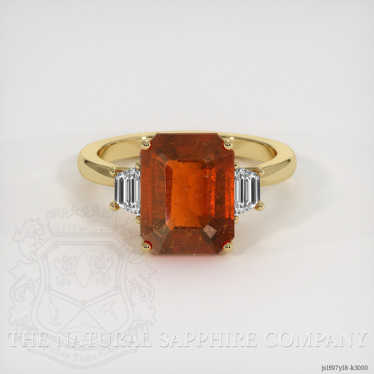 The ring features a beautiful, transparent GIA certified Reddish Orange 4.55 carat emerald cut shape reddish orange grossulargarnet with the dimensions of 11.03 x 8.45 x 5.20 mm and a emerald cut. It has a clarity grade of slightly included (evaluated at eye level), vivid color saturation, and an excellent polish. The origin of this grossulargarnet is Nambia.