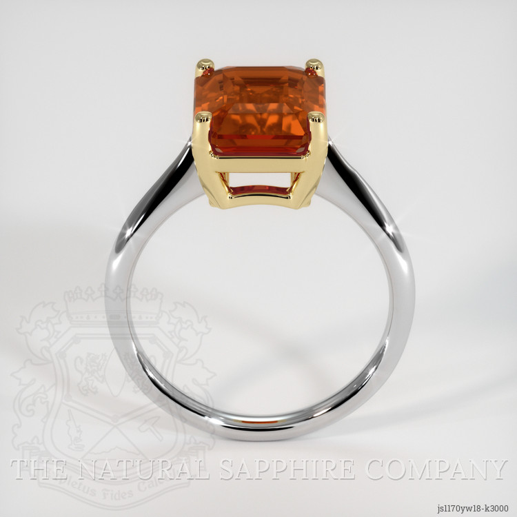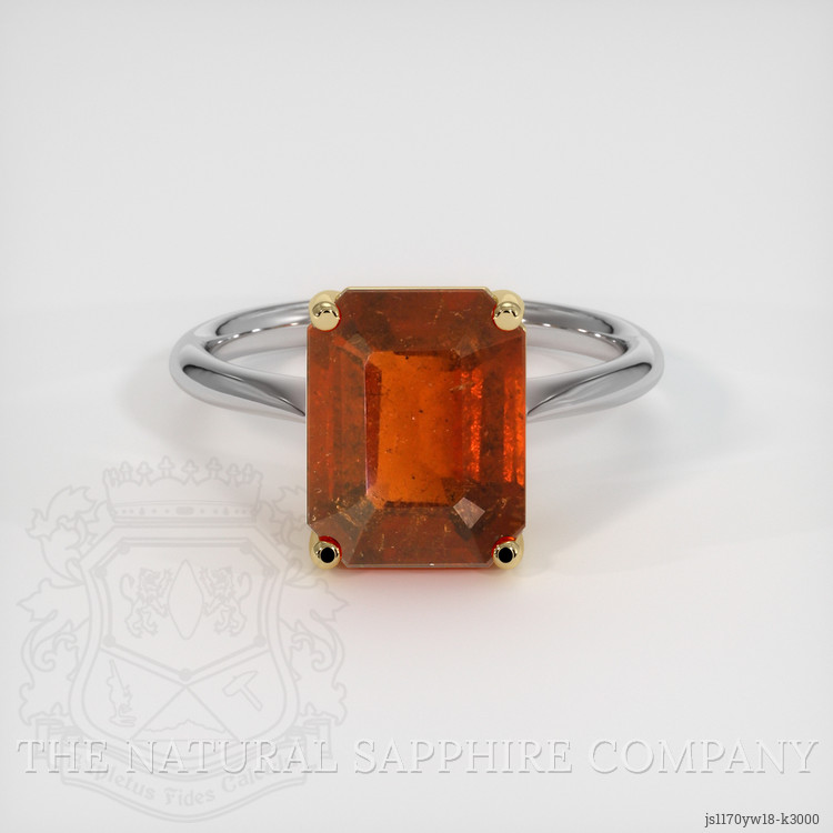 The ring features a beautiful, transparent GIA certified Reddish Orange 4.55 carat emerald cut shape reddish orange grossulargarnet with the dimensions of 11.03 x 8.45 x 5.20 mm and a emerald cut. It has a clarity grade of slightly included (evaluated at eye level), vivid color saturation, and an excellent polish. The origin of this grossulargarnet is Nambia.