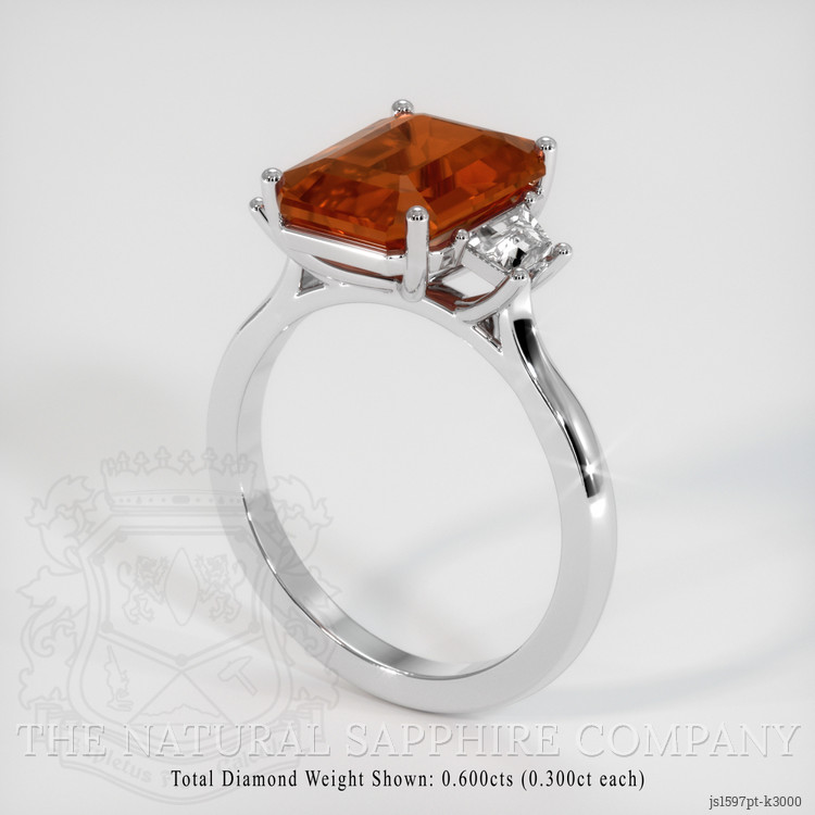 The ring features a beautiful, transparent GIA certified Reddish Orange 4.55 carat emerald cut shape reddish orange grossulargarnet with the dimensions of 11.03 x 8.45 x 5.20 mm and a emerald cut. It has a clarity grade of slightly included (evaluated at eye level), vivid color saturation, and an excellent polish. The origin of this grossulargarnet is Nambia.