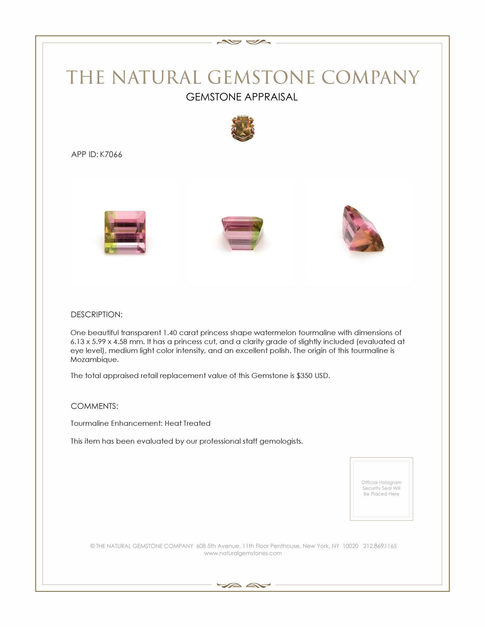 Indulge in the exquisite allure of The Natural Gemstone Company's latest masterpiece—an emblem of refined elegance and conscious luxury. Crafted with an extraordinary 1.40 carat princess-shaped watermelon tourmaline, this ring captures the sublime beauty of nature. Transparent and poised, the gemstone reflects a medium light color saturation that dances with vibrant hues. Its origins trace back to the lush landscapes of Mozambique, where ethical sourcing practices are paramount. By choosing our watermelon tourmaline, you embrace a piece whose provenance is rooted in careful stewardship of Earth's treasures, aligning with a sense of responsibility and exquisite taste.