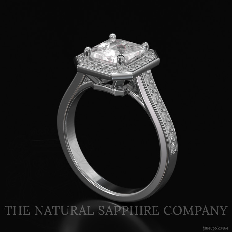The ring features a beautiful, semi-transparent 1.20 carat radiant shape white moonstone with the dimensions of 7.19 x 6.41 x 4.43 mm and a radiant cut. It has a clarity grade of very slightly included (evaluated at eye level), colorless color saturation, and an excellent polish. The origin of this moonstone is Ceylon (Sri Lanka).