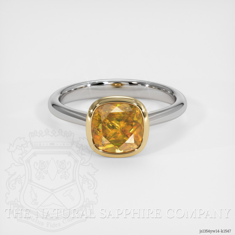 The men's ring features a beautiful, transparent 2.13 carat cushion shape yellowish brown sphene with the dimensions of 7.58 x 7.51 x 5.06 mm and a mixed brilliant cut. It has a clarity grade of slightly included (evaluated at eye level), intense color saturation, and an excellent polish. The origin of this sphene is Madagascar.