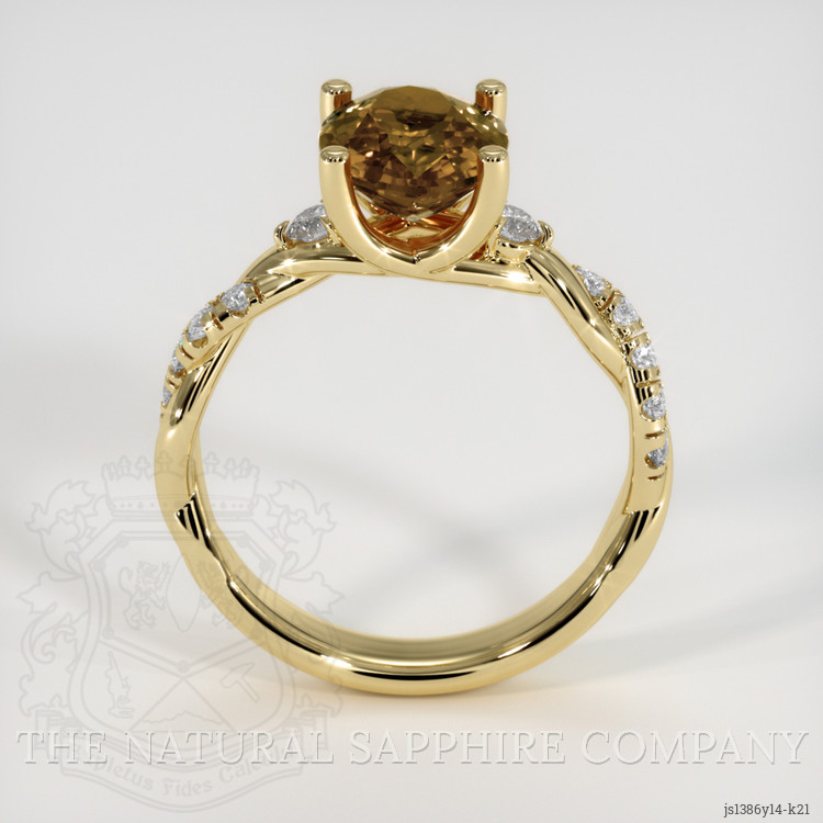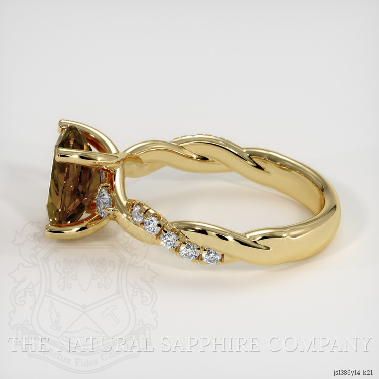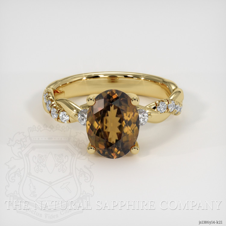 The ring features a beautiful, transparent 2.82 carat oval shape yellowish brown zircon with the dimensions of 9.50 x 7.26 x 4.23 mm and a mixed brilliant cut. It has a clarity grade of very slightly included (evaluated at eye level), intense color saturation, and an excellent polish. The origin of this zircon is Ceylon (Sri Lanka).