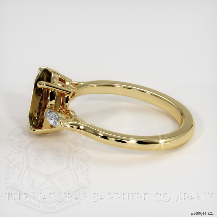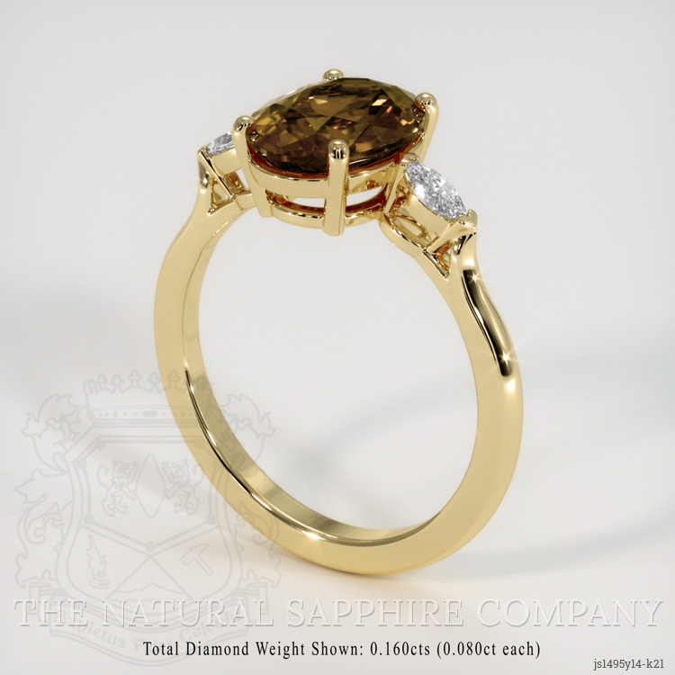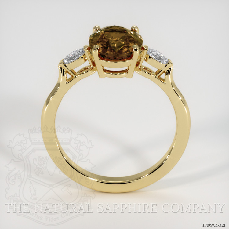 The ring features a beautiful, transparent 2.82 carat oval shape yellowish brown zircon with the dimensions of 9.50 x 7.26 x 4.23 mm and a mixed brilliant cut. It has a clarity grade of very slightly included (evaluated at eye level), intense color saturation, and an excellent polish. The origin of this zircon is Ceylon (Sri Lanka).