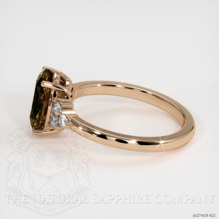 The ring features a beautiful, transparent 2.82 carat oval shape yellowish brown zircon with the dimensions of 9.50 x 7.26 x 4.23 mm and a mixed brilliant cut. It has a clarity grade of very slightly included (evaluated at eye level), intense color saturation, and an excellent polish. The origin of this zircon is Ceylon (Sri Lanka).