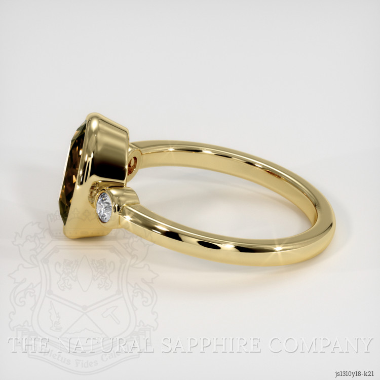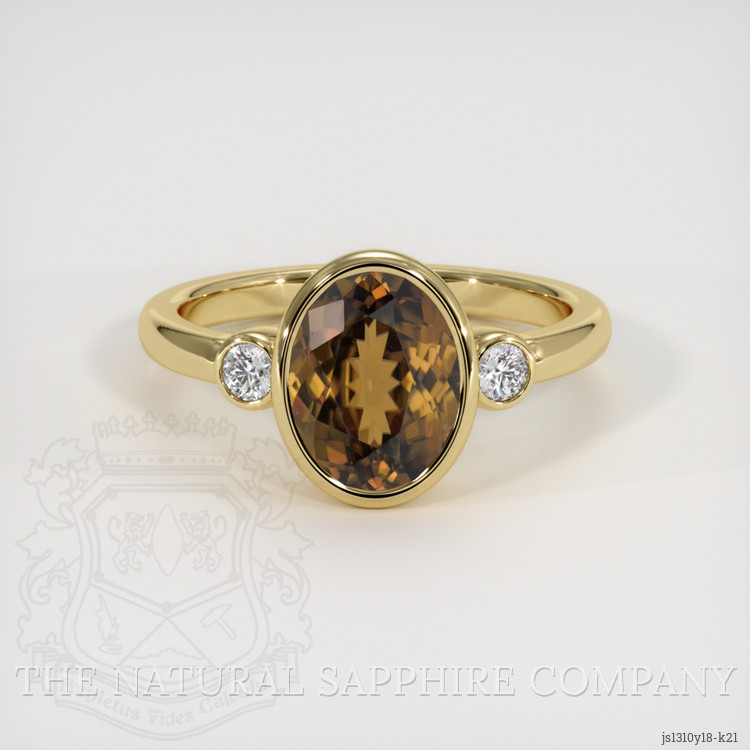 The ring features a beautiful, transparent 2.82 carat oval shape yellowish brown zircon with the dimensions of 9.50 x 7.26 x 4.23 mm and a mixed brilliant cut. It has a clarity grade of very slightly included (evaluated at eye level), intense color saturation, and an excellent polish. The origin of this zircon is Ceylon (Sri Lanka).