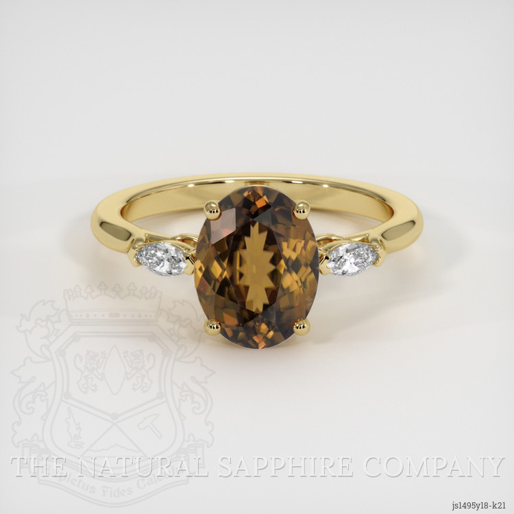 The ring features a beautiful, transparent 2.82 carat oval shape yellowish brown zircon with the dimensions of 9.50 x 7.26 x 4.23 mm and a mixed brilliant cut. It has a clarity grade of very slightly included (evaluated at eye level), intense color saturation, and an excellent polish. The origin of this zircon is Ceylon (Sri Lanka).