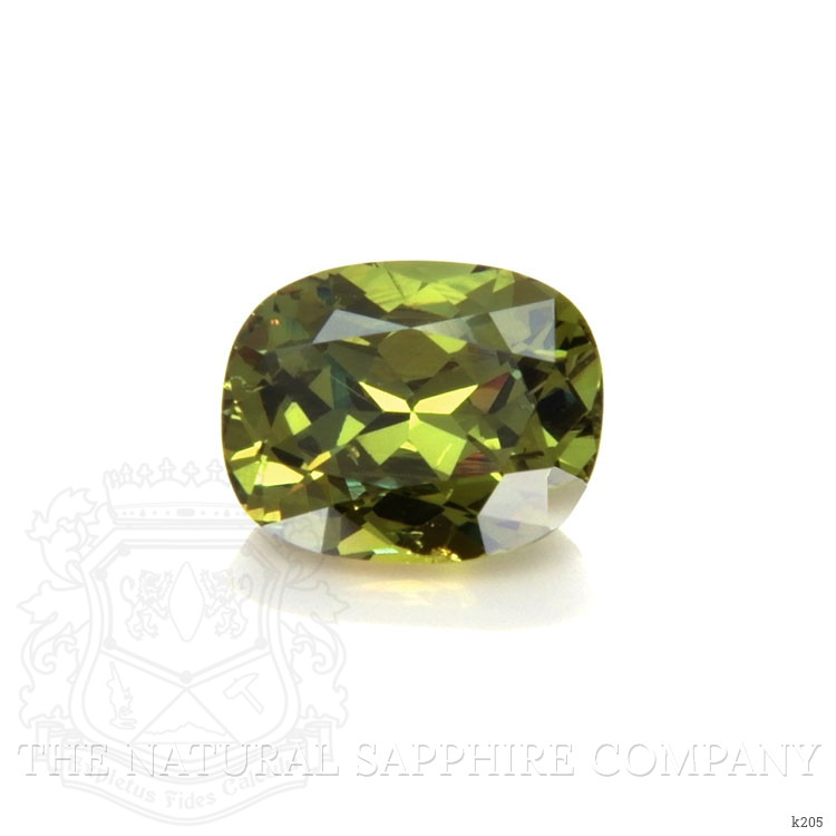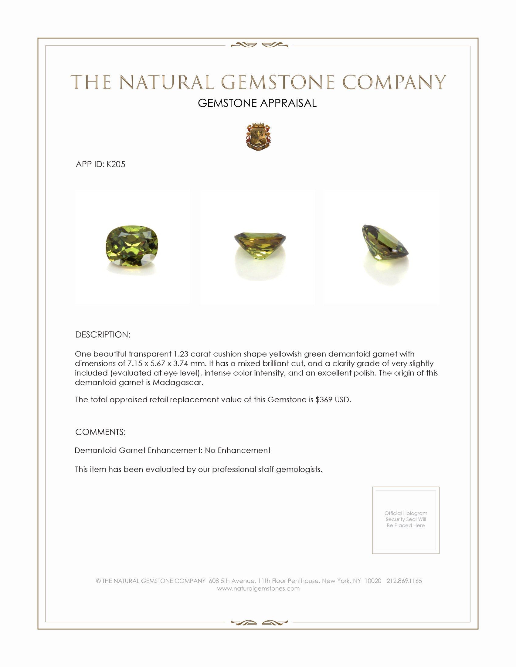 The men's ring features a beautiful, transparent 1.23 carat cushion shape yellowish green demantoidgarnet with the dimensions of 7.15 x 5.67 x 3.74 mm and a mixed brilliant cut. It has a clarity grade of very slightly included (evaluated at eye level), intense color saturation, and an excellent polish. The origin of this demantoidgarnet is Madagascar.