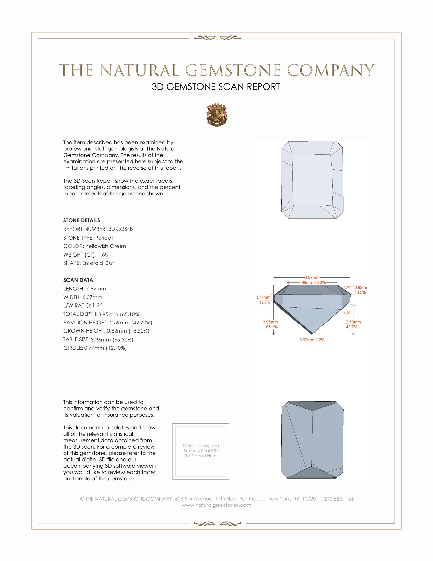 Discover the epitome of elegance with our exquisite peridot ring from The Natural Gemstone Company. Featuring a stunning 1.68 carat emerald cut peridot sourced from Pakistan, this ring effortlessly stands out in a sea of ordinary jewelry. Measuring 7.62 x 6.07 x 3.95 mm with a fancy cut, this gemstone captivates with its intense yellowish-green hue and is set in 14K yellow gold that complements its vibrant color. The clarity grade of very slightly included ensures a pristine viewing experience while adding a touch of character that is unique to each piece. This ring showcases exactly why natural gemstones are not just beautiful, but also uniquely individual.