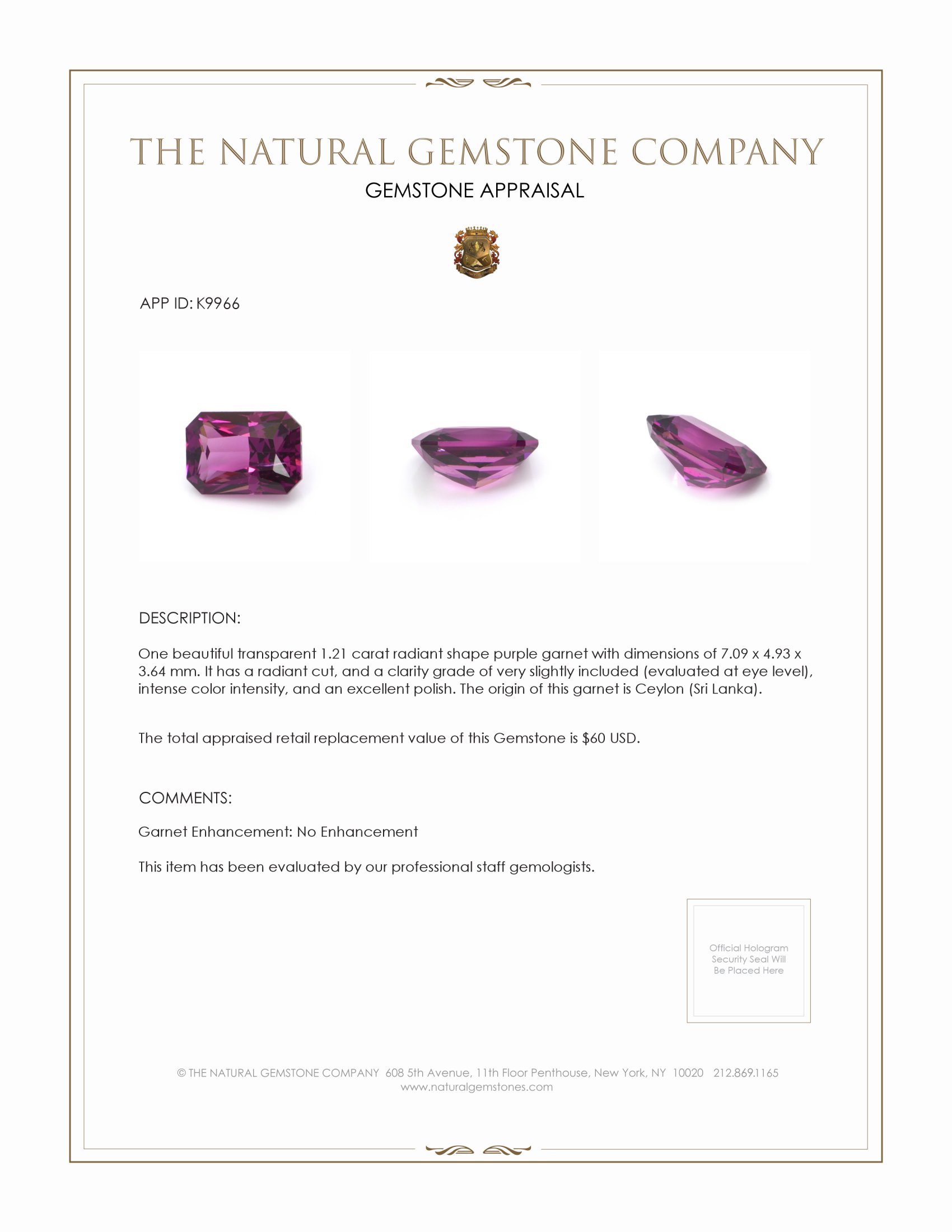 The Natural Gemstone Company presents a truly exceptional offering with our radiant shape purple garnet, weighing in at a noteworthy 1.21 carats. Sourced ethically from the renowned gem-producing region of Ceylon in Sri Lanka, this garnet is a testament to both natural beauty and skilled craftsmanship. The dimensions of the gem, measuring 7.09 x 4.93 x 3.64 mm, strike an admirable balance between substantial presence and refined elegance, allowing it to serve as both a focal point in ornate jewelry designs and a standalone statement piece.