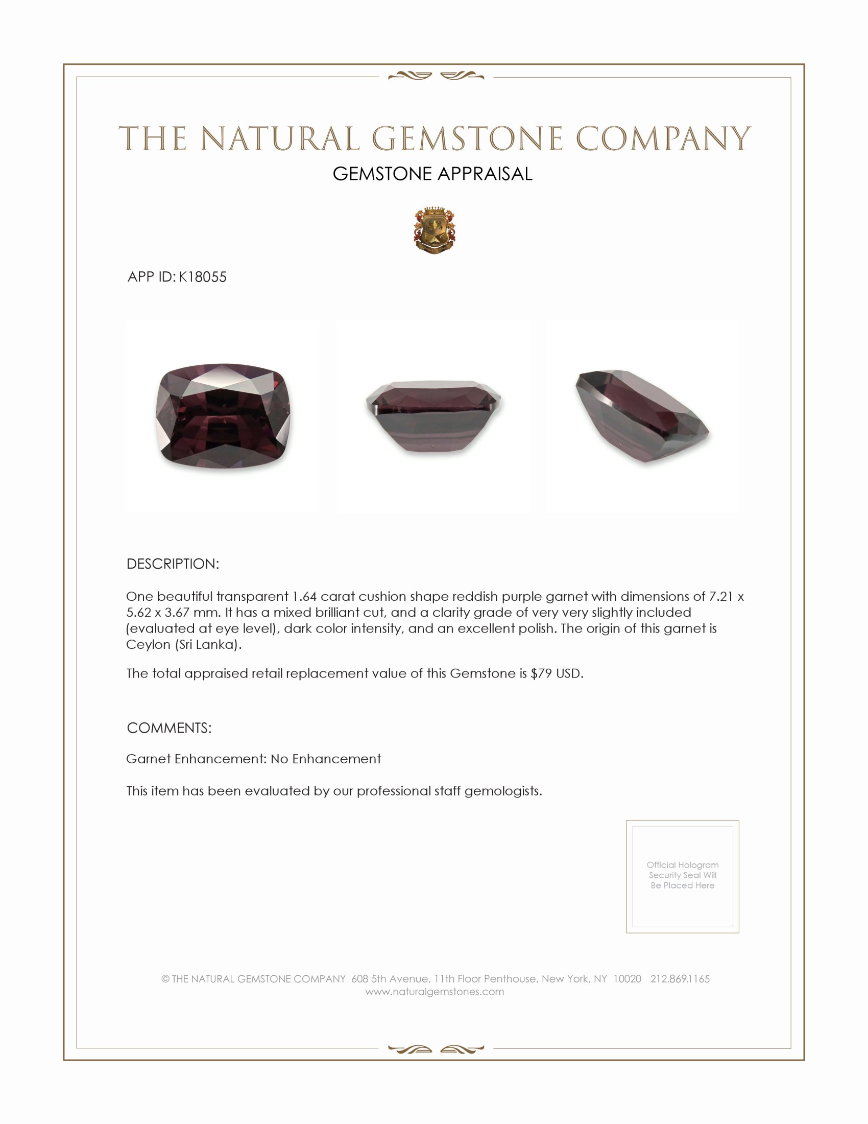 This listing describes a single transparent garnet weighing 1.64 carats, cut into a classic cushion outline, with exact dimensions of 7.21 by 5.62 by 3.67 millimeters. The stone presents a rich reddish purple hue with dark color intensity, and it is an untreated natural gem, originating from Ceylon Sri Lanka. The clarity is graded very very slightly included, evaluated at eye level, and the surface finish is described as excellent polish. The mixed brilliant cutting style has been employed to balance the demands of deep color saturation and optimized light return, and this piece is offered by The Natural Gemstone Company with full provenance of origin and treatment as no enhancement.