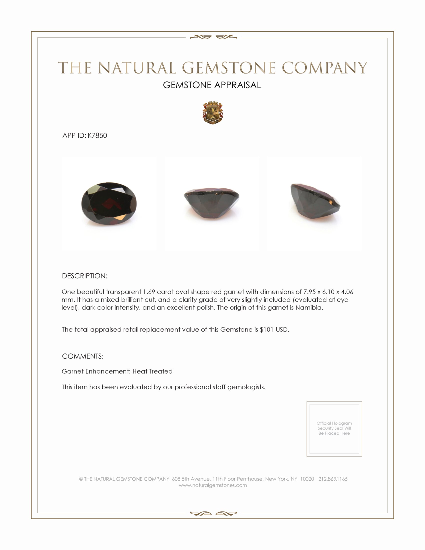 Introducing a remarkable treasure from The Natural Gemstone Company: a captivating transparent 1.69-carat oval-shaped red garnet. This exquisite gemstone, measuring 7.95 x 6.10 x 4.06 mm, possesses a mixed brilliant cut known for maximizing brightness and brilliance while maintaining its delicate oval silhouette. Exemplifying exceptional craftsmanship, this garnet features an excellent polish, enhancing its natural allure and enabling light to dance across its surface mesmerizingly. With a clarity grade of very slightly included, as evaluated at eye level, this gem reveals only minuscule inclusions that are a testament to its authenticity and natural origin rather than detracting from its splendor.