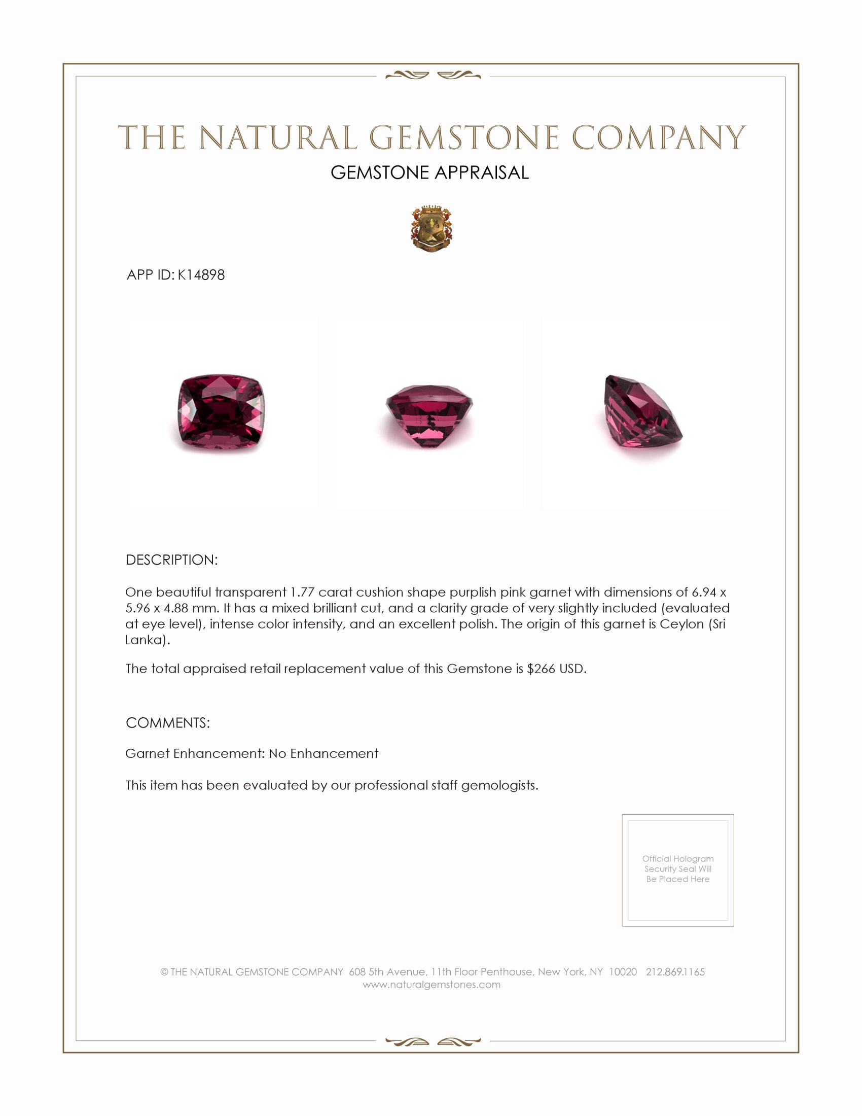 Discover the allure of our exquisite 1.77 carat cushion shape purplish pink garnet, a gemstone that promises to transform any jewelry setting into a masterpiece of elegance and emotion. This gemstone, sourced from the idyllic landscapes of Ceylon, exudes a vibrant color that cannot help but capture the heart and imagination of those who behold it. Envision the moment you present this breathtaking gem to a loved one, a dazzling testament to enduring affection and cherished memories, courtesy of The Natural Gemstone Company.