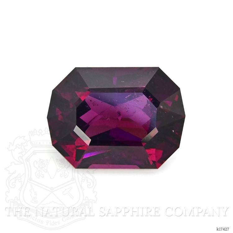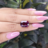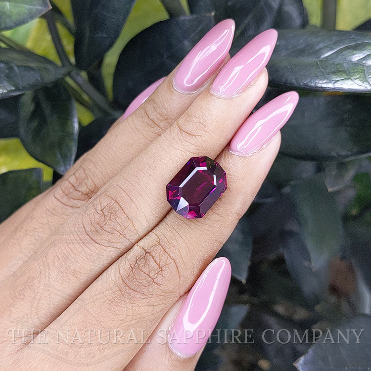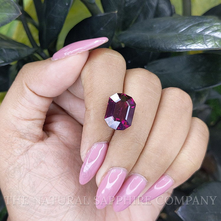Its hue and tonal complexity invite comparison to some of the world s most celebrated gems, yet it remains entirely its own. At face up, the dominant note is a sumptuous pinkish purple, richer and more saturated than many Sri Lankan rhodolites that tend to carry a lighter, rose pink disposition, and cooler by comparison to the hot, pigeon blood warmth of classic Burmese rubies. Viewed through the step cut s planes, the stone reveals a layered depth reminiscent of Kashmir sapphires in their velvet like diffusion, though where a Kashmir sapphire leans toward a pure blue violet, this garnet speaks in pomegranate and plum, a warmer spectrum that holds a subtle red heartbeat. When compared to garnets from Mozambique and Madagascar, which can range from fiery crimson to pure garnet red, this Tanzanian piece distinguishes itself with a unique interplay of vibrancy and restraint, like a fine Bordeaux that reads as both lively and composed, and when seen in certain light it echoes the rare, evening mauves of Sri Lankan spinel, offering secondary tones that shift from deep magenta to regal eggplant. The combination of step cutting and vivid saturation creates zones of light and dark that are similar to the dramatic color zoning sometimes admired in Umba Valley garnets, while remaining more transparent and crystalline, an attribute that speaks to its careful sourcing and the superior material selected for this cut.