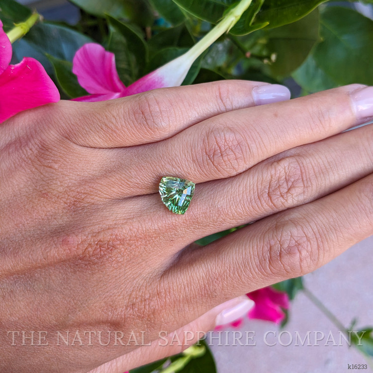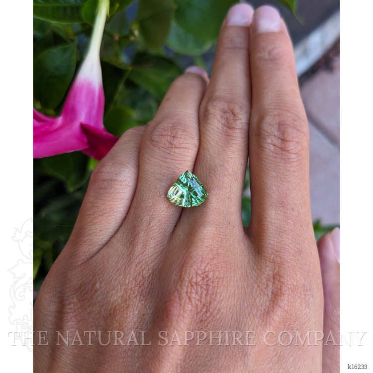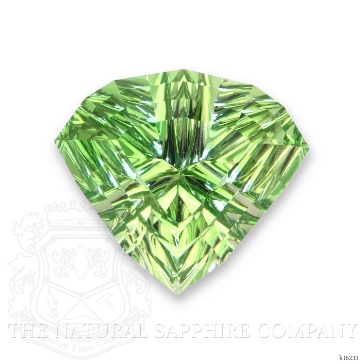 Introducing an exquisite 4.39 carat fancy shape green garnet, a genuine gemstone that reflects the precision and craftsmanship The Natural Gemstone Company is known for. This remarkable gem, with its transparency and dimensions of 9.61 x 10.87 x 6.85 mm, exemplifies a superior designer cut that enhances its visual appeal. Evaluated at eye level with an eye clean clarity grade, this garnet presents a pristine allure without visible inclusions. Its intense color intensity amplifies the vivid green hue, showcasing the stone's natural beauty. Furthermore, it shines with an excellent polish, ensuring a surface that reflects light effortlessly, adding deeper brilliance and charm.