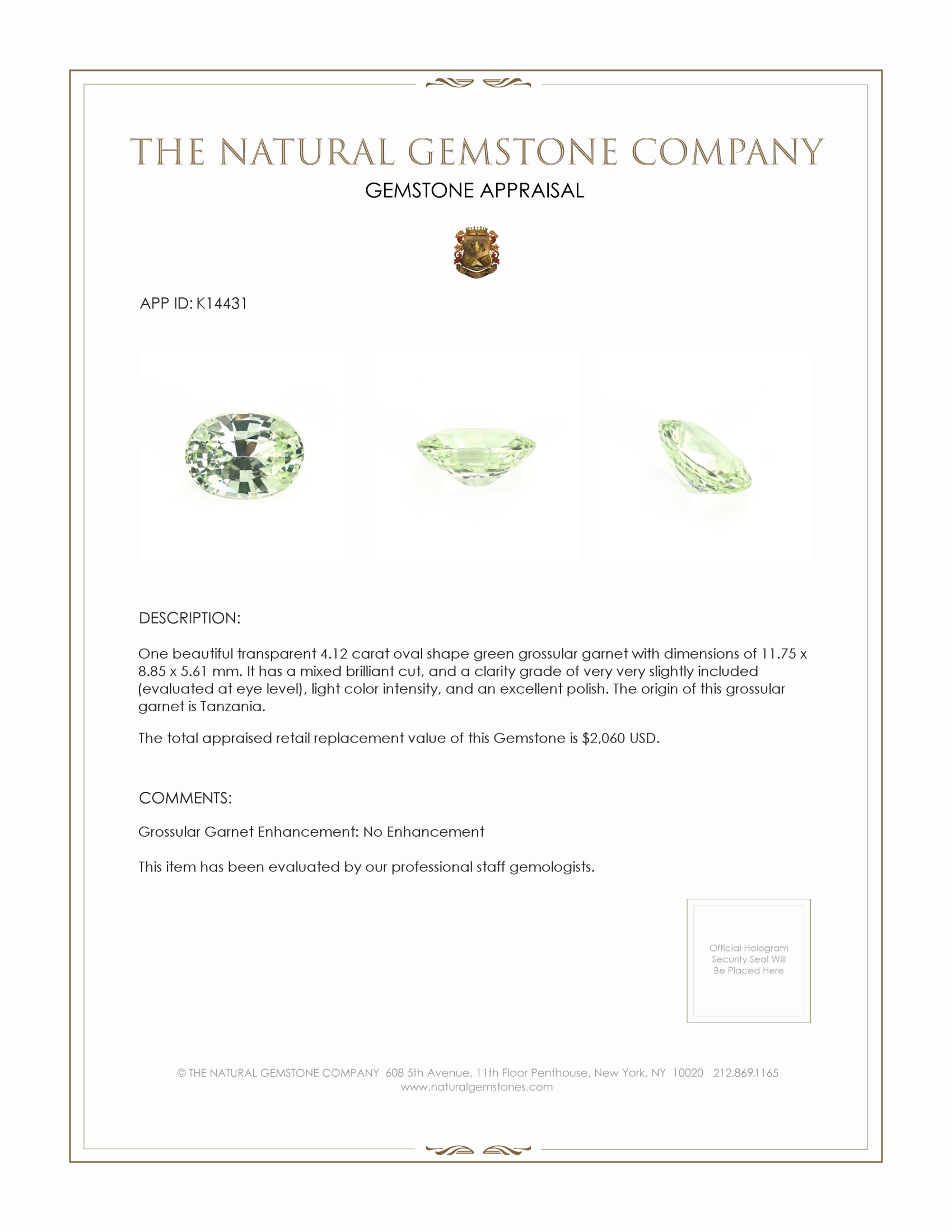 This transparent green grossular garnet takes your aspirations and completes them with precision, style, and flair. Trust in a gem where each dimension, color, and cut work in harmony to deliver a brilliance that is truly unforgettable. The Natural Gemstone Company invites you to experience the sensation of owning a piece that fulfills your desires for unmatched beauty, making the search for perfection conclude with this extraordinary gemstone.