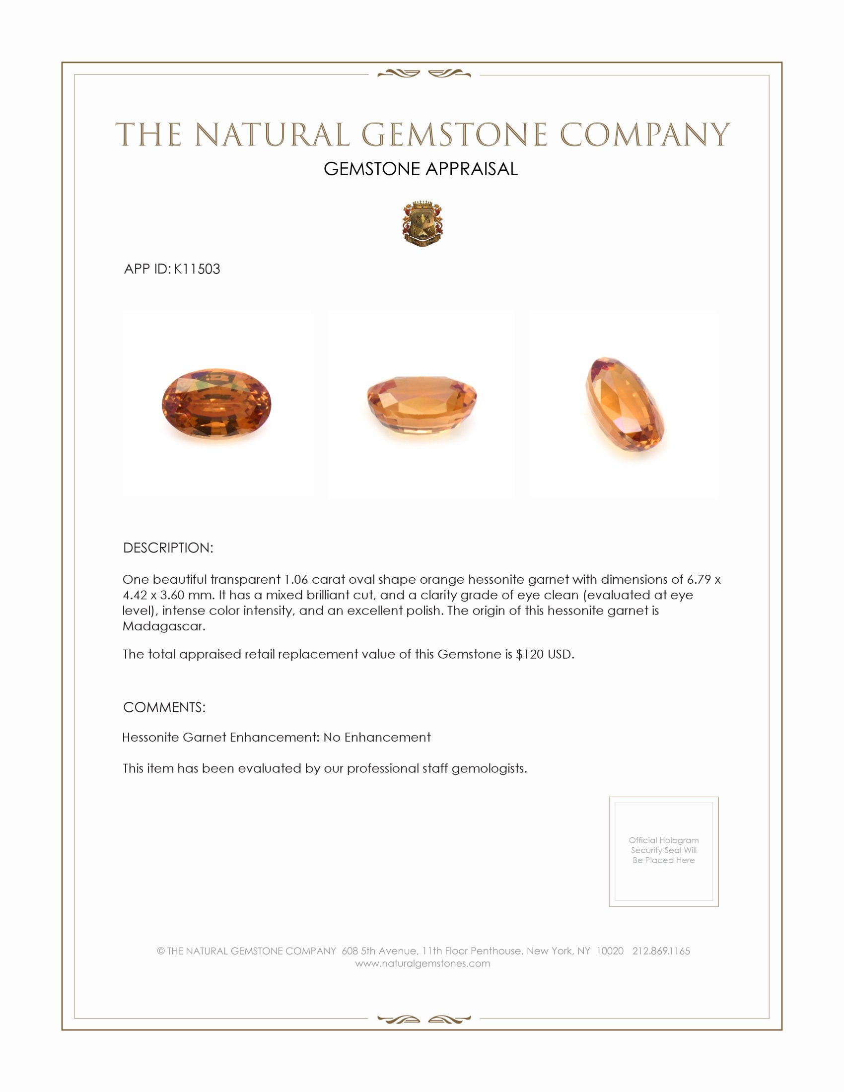 The 1.06 carat oval-shaped orange hessonite garnet from The Natural Gemstone Company is a testament to both geological wonder and meticulous craftsmanship. This transparent gem, sourced from the renowned mineral-rich landscapes of Madagascar, embodies a legacy of gemstone forming over millions of years. Its dimensions, precisely measured at 6.79 millimeters in length, 4.42 millimeters in width, and 3.60 millimeters in depth, highlight the careful planning involved in its extraction and preparation. These measurements not only accentuate the gem's balanced proportions but also ensure a harmonious fit in a variety of jewelry settings preferred by discerning gem enthusiasts.