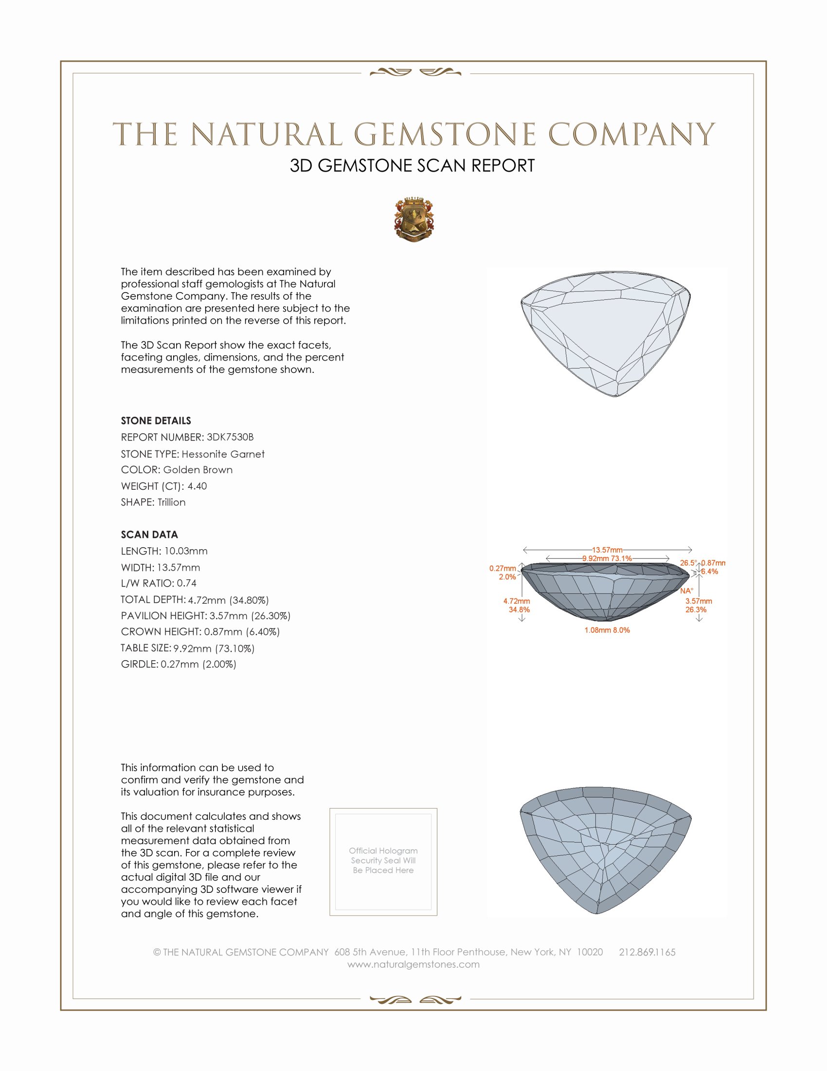 When considering the perfect gemstone to elevate the elegance and allure of a custom jewelry piece, The Natural Gemstone Company's exquisite 4.40 carat trillion shape golden brown hessonite garnet stands unparalleled in the market. With its origin gracing from the renowned gemstone-rich region of Ceylon, Sri Lanka, this garnet is far more than a mere stone; it is a testament to quality and refined taste. While other gemstones may offer color or cut, this hessonite garnet promises a harmonious blend of both, giving it an edge over alternatives. The trillion cut, in particular, is revered for its ability to capture light and reflect it in a mesmerizing dance, ensuring that this garnet shines brighter and commands attention whether worn as a statement piece or as an accent in a more intricate design.