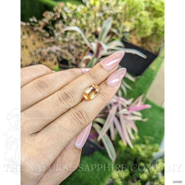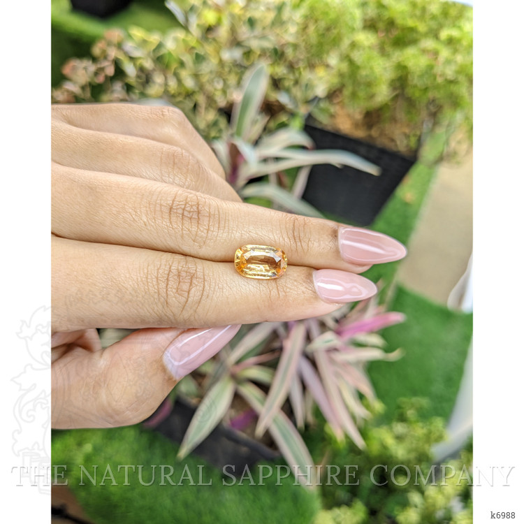 The Natural Gemstone Company proudly presents an exquisite offering from its curated collection of distinguished gems: a transparent 4.43 carat cushion-shaped yellowish-orange hessonite garnet. This gemstone has an allure that is defined by its exceptional quality and extraordinary craftsmanship. Sourced from the rich and historic mines of India, the hessonite garnet is a true testament to the artistry and precision that is synonymous with the Natural Gemstone Company's reputation for excellence.