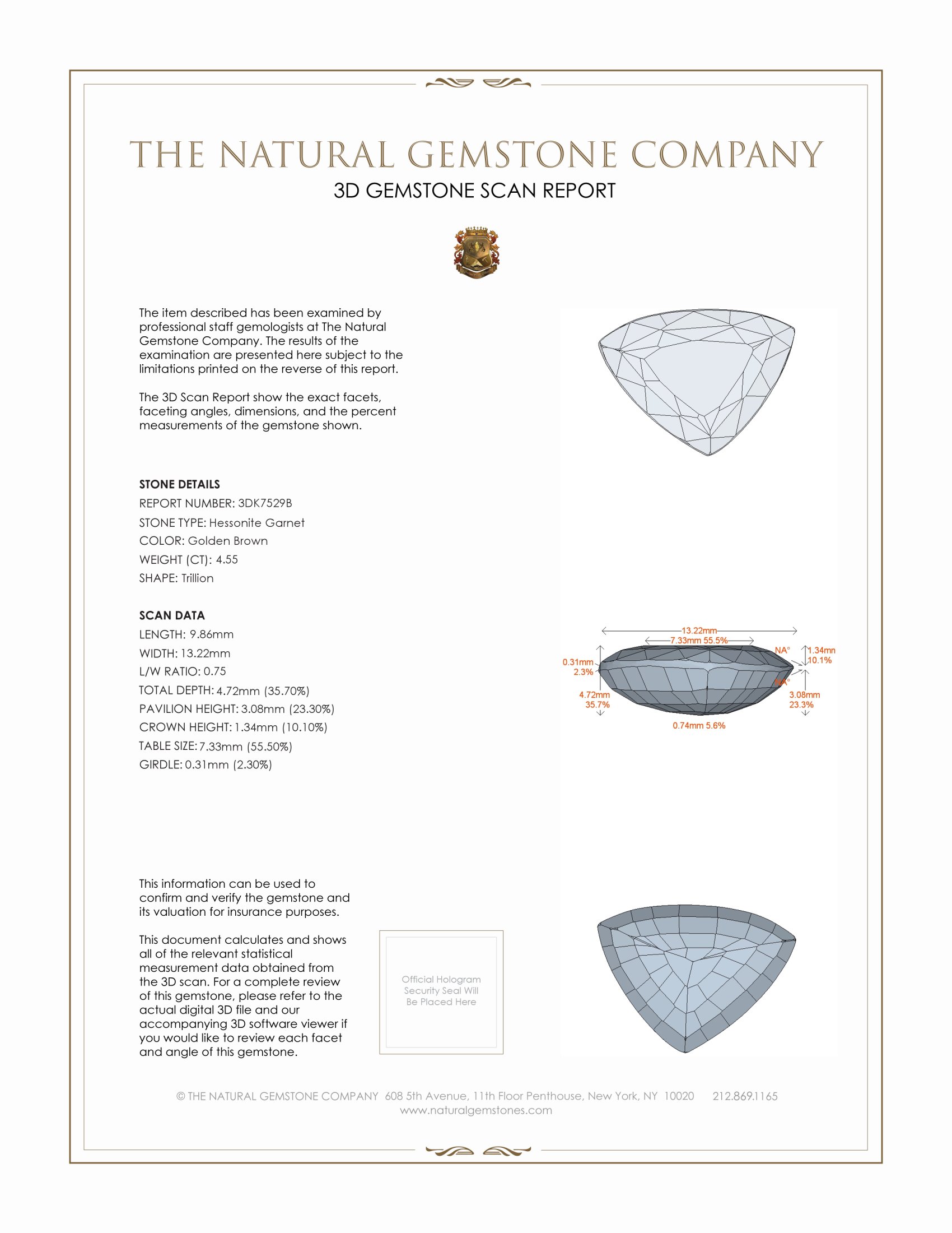 At The Natural Gemstone Company, we understand that the pursuit of exceptional elegance is more than just an interest, it is a passion. Our exquisite 4.55-carat golden brown hessonite garnet is crafted to satisfy such discerning tastes, standing as a beacon for those who seek not merely beauty, but an extraordinary presence. Originating from the storied lands of Ceylon, now known as Sri Lanka, this hessonite garnet encapsulates the allure and mystery of its rich heritage. It is more than just a gemstone, it is a journey, a transformation narrated through its beautifully transparent depths and distinctive trillion shape.