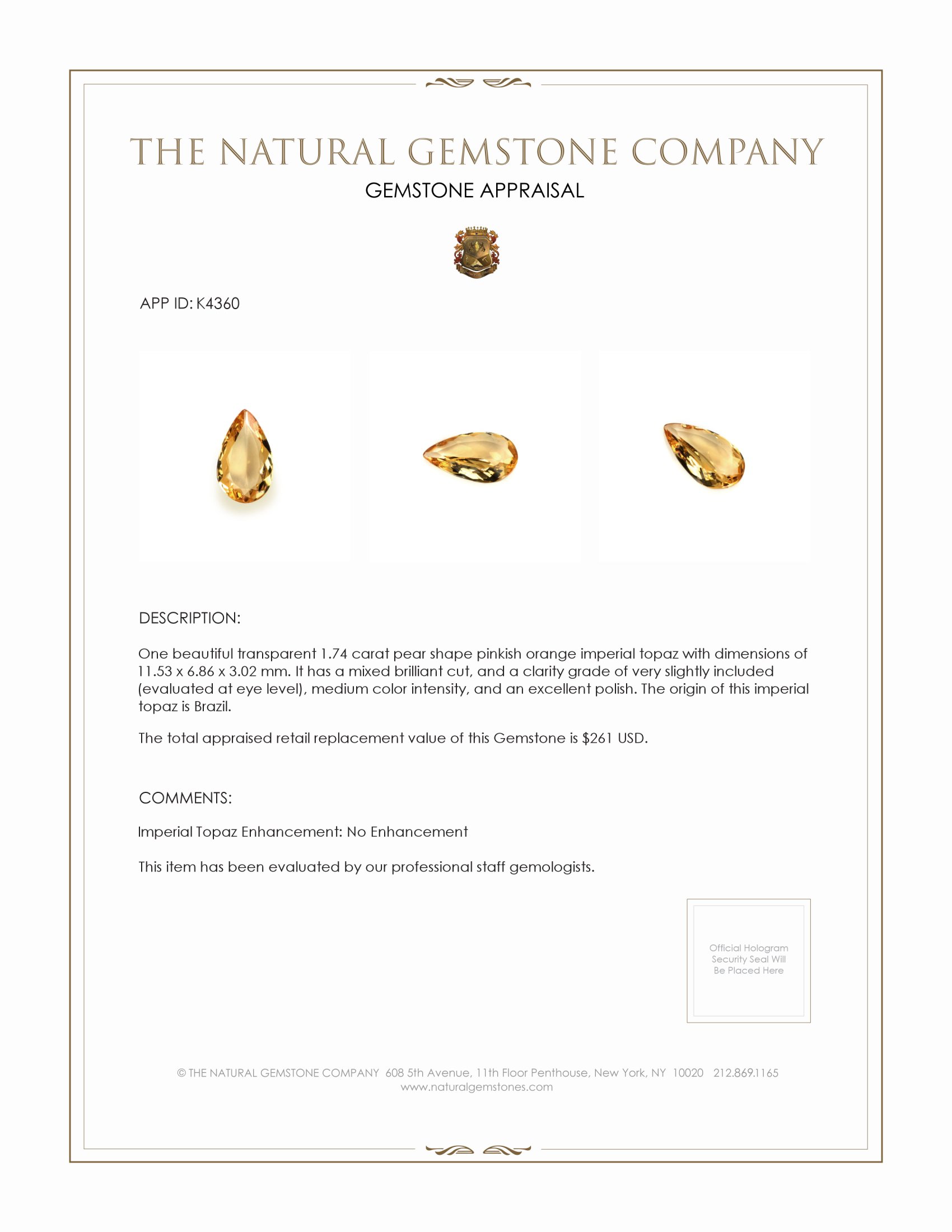 Introducing the centerpiece of any exquisite jewelry collection, the beautiful transparent 1.74 carat pear-shaped pinkish orange imperial topaz stands out as a crown jewel that commands attention and admiration. Sourced from the renowned gem-producing regions of Brazil, this topaz is not just a gemstone; it's a masterpiece of nature, waiting to elevate any ensemble with its stunning array of features. Whether you are seeking the perfect piece to crown a treasured collection or are in search of a unique ring for a forthcoming engagement, let The Natural Gemstone Company guide you on your path to selecting a truly special gem.