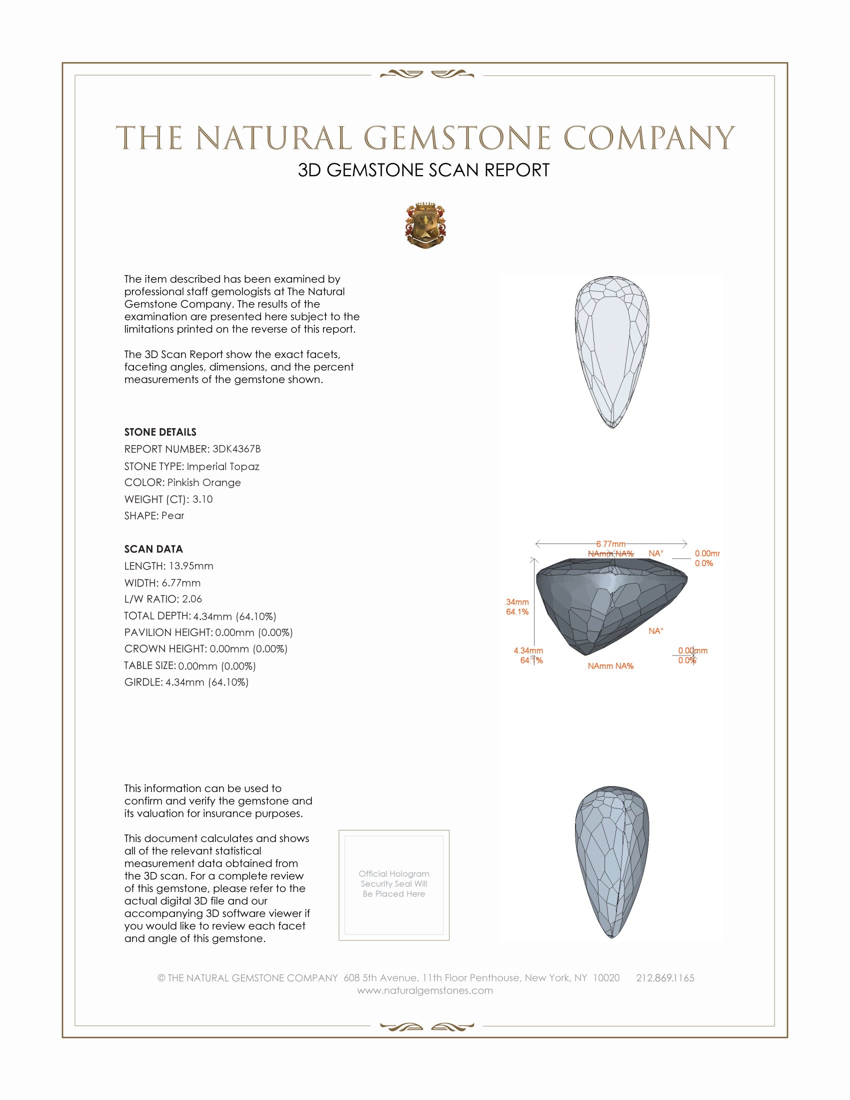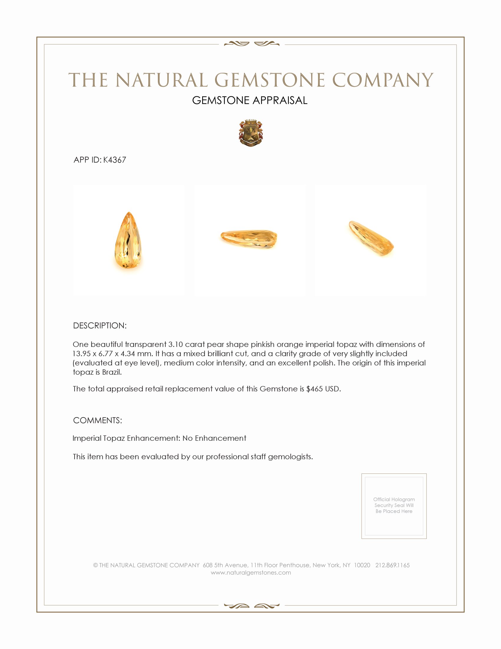 Thus, with its sojourning beauty and everlasting elegance, the beautiful transparent 3.10 carat pear-shaped imperial topaz represents an esteemed addition to any collection. As a tangible link to the earth and a legacy to pass through generations, owning this gem is not just about possessing a piece of art but subscribing to a story that binds the significance of the past, the splendor of the present, and the promising potential of the future and beyond. The Natural Gemstone Company prides itself on offering only such distinguished pieces, ensuring that each gemstone isn’t merely accompanied by beauty, but also by a narrative that resonates deeply, inspiring confidence and admiration in your investment for years to come.