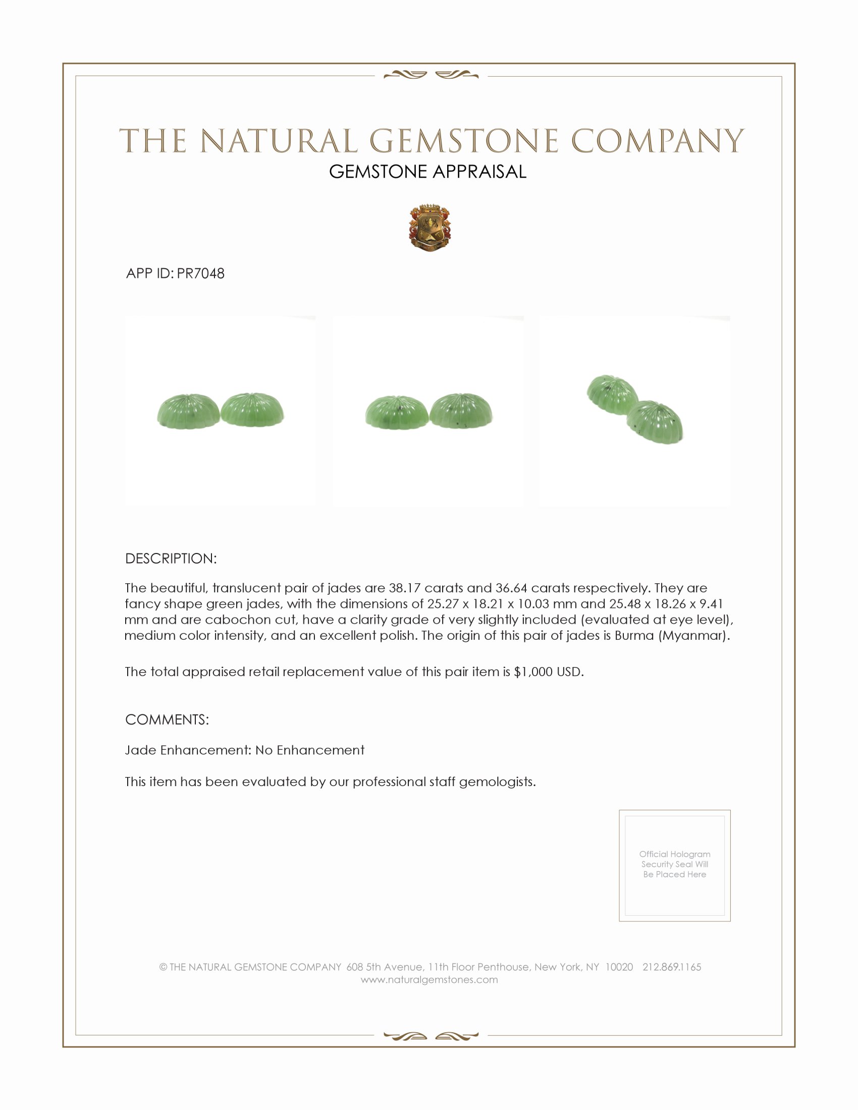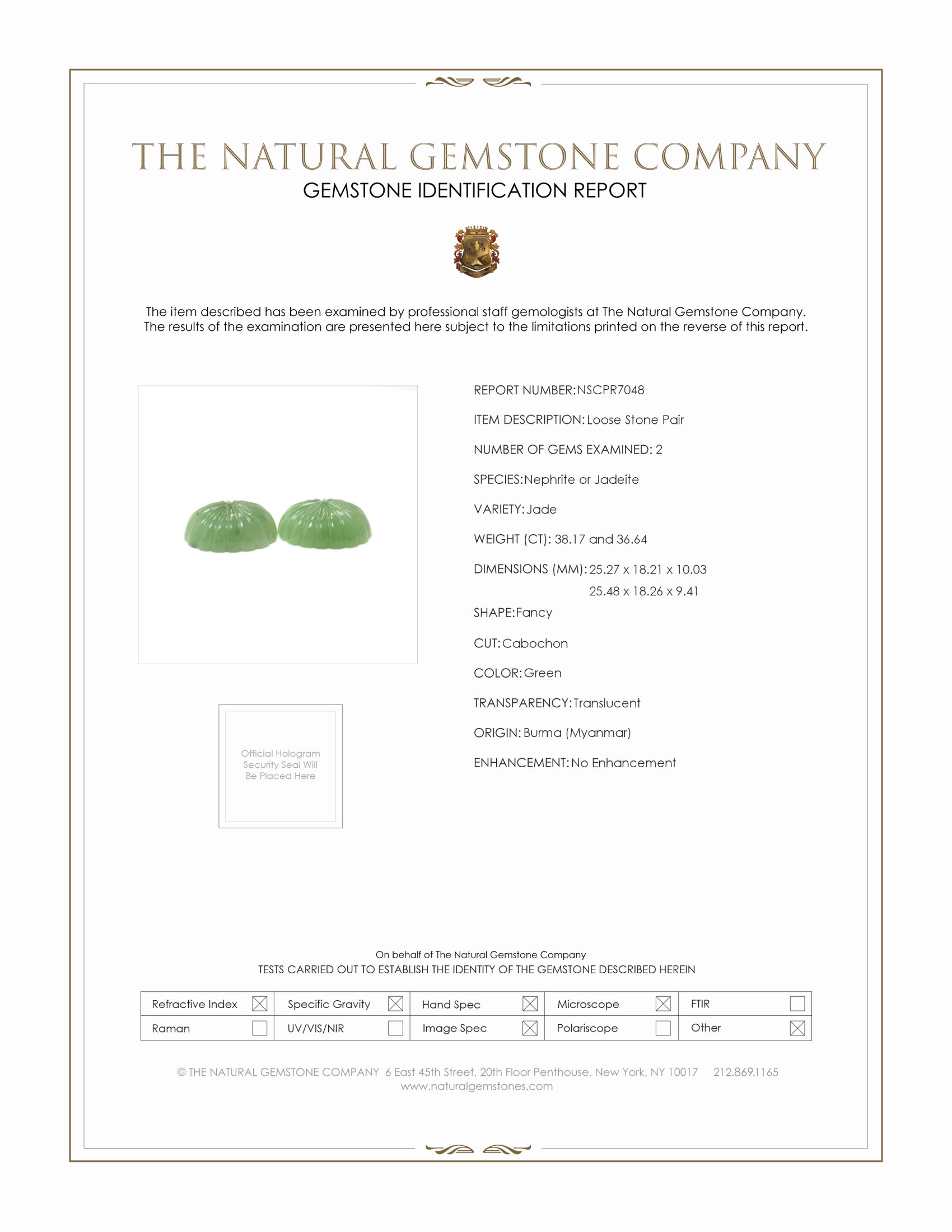 Stone Type: Jade, Weight: 38.17 carats and 36.64 carats, Enhancement: None, Origin: Burma (Myanmar), Clarity: Very slightly included (evaluated at eye level), Color: Green, Intensity: Medium, Shape: Fancy, Dimension: 25.27 x 18.21 x 10.03 mm and 25.48 x 18.26 x 9.41 mm, Transparency: Translucent, Cut: Cabochon.