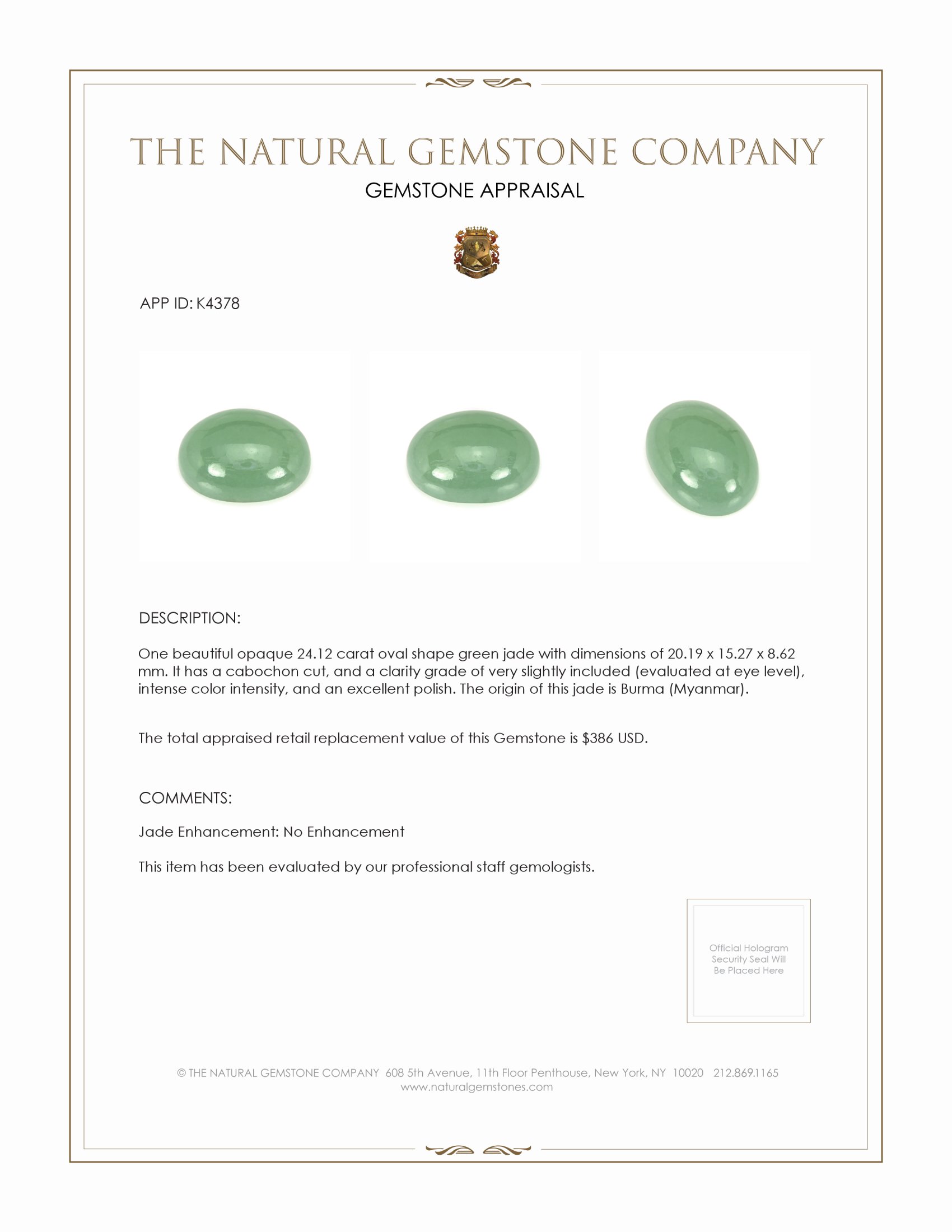 Introducing a timeless treasure from The Natural Gemstone Company that transcends the boundaries of elegance and sophistication—a breathtaking opaque green jade gemstone. This stunning jewel, sourced from the historical landscapes of Burma, now Myanmar, is more than just an accessory—it is the fulfillment of your refined search for beauty and rarity. Cut to perfection with an impressive 24.12-carat weight, this oval-shaped jade with dimensions of 20.19 x 15.27 x 8.62 mm promises to meet the highest standards of style and taste. With its cabochon cut and an eye-level clarity grade that is very slightly included, it embodies both artistry and nature's finest work, offering you a piece that is truly unique in its charm and appeal.