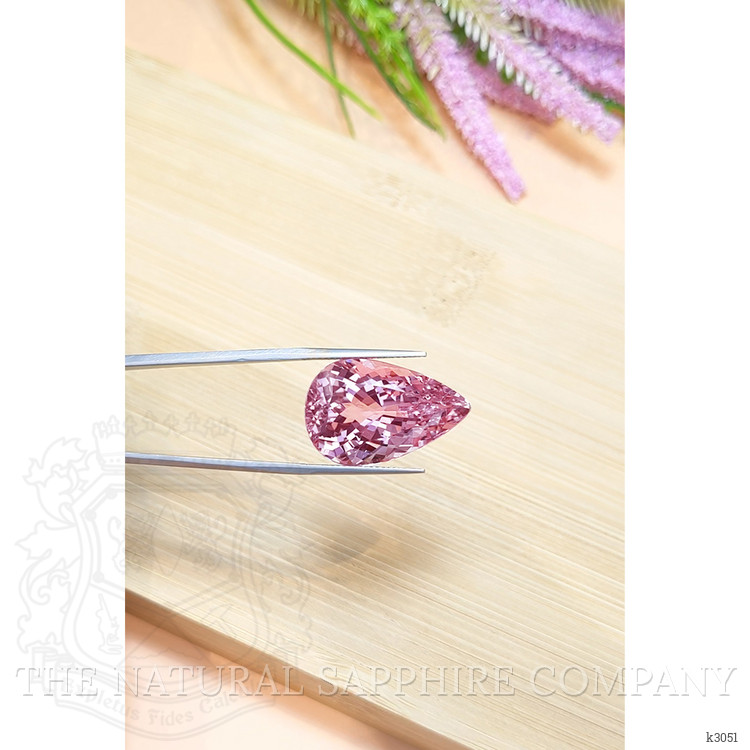 The described kunzite gemstone is an exquisite example of the type, being transparent and weighing a substantial 26.95 carats. Its pear shape and mixed brilliant cut enhance its luster and showcase the gemstone's natural beauty. Measuring 23.01 x 15.20 x 11.80 mm, it is a sizable stone that could serve as a show-stopping centerpiece in a variety of jewelry settings.