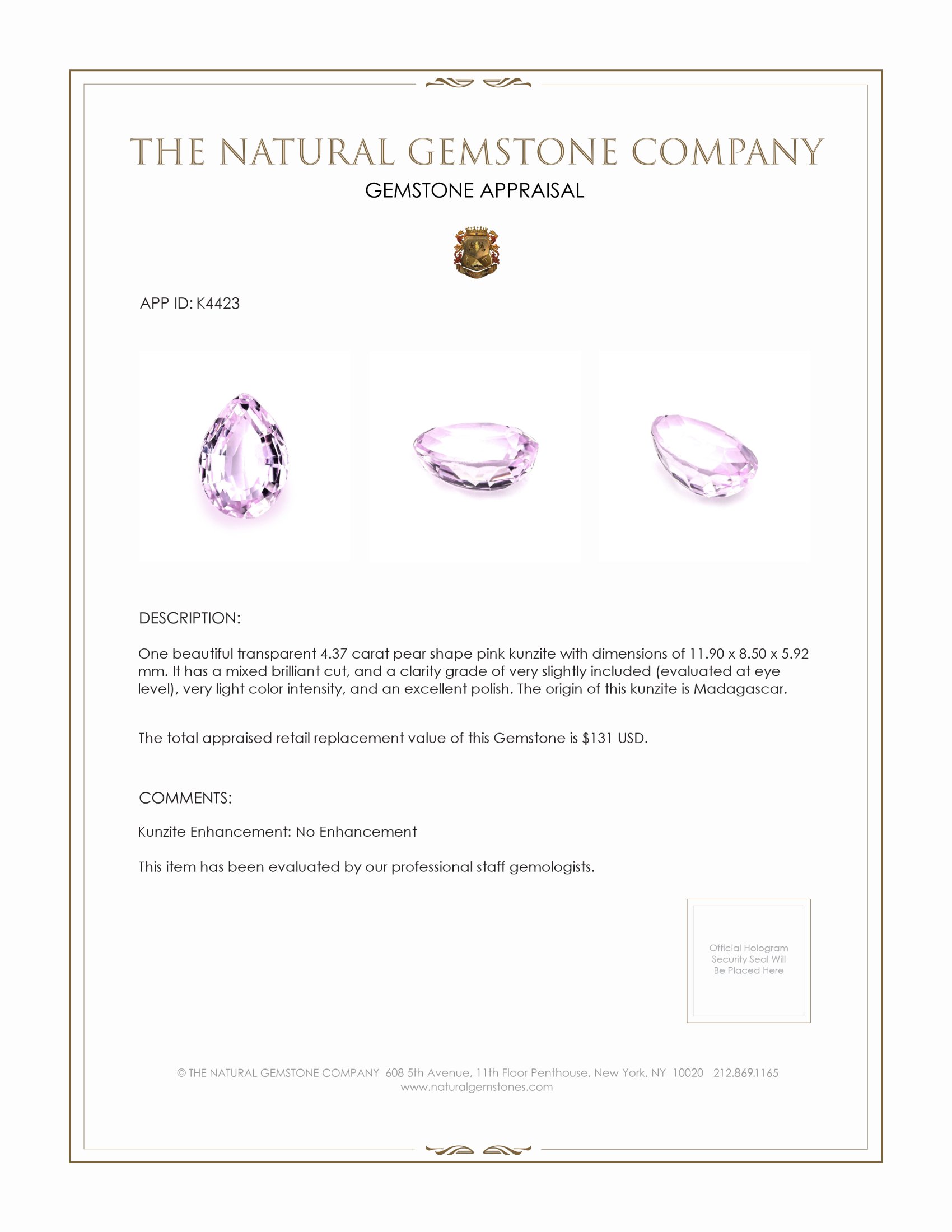 Its clarity, graded at very slightly included, whispers of its journey and growth in the soothing embrace of the earth. Yet, with its very light color intensity, it exudes a subtlety that makes it adaptable to various settings, whether as a standalone statement or a harmonious complement to other gems. With excellent polish that seals its transformation from a rough stone to a work of art, this pink kunzite encases the essence of nature and human artistry, a testimony to the storied path that led to its refined beauty—a remarkable piece from The Natural Gemstone Company.